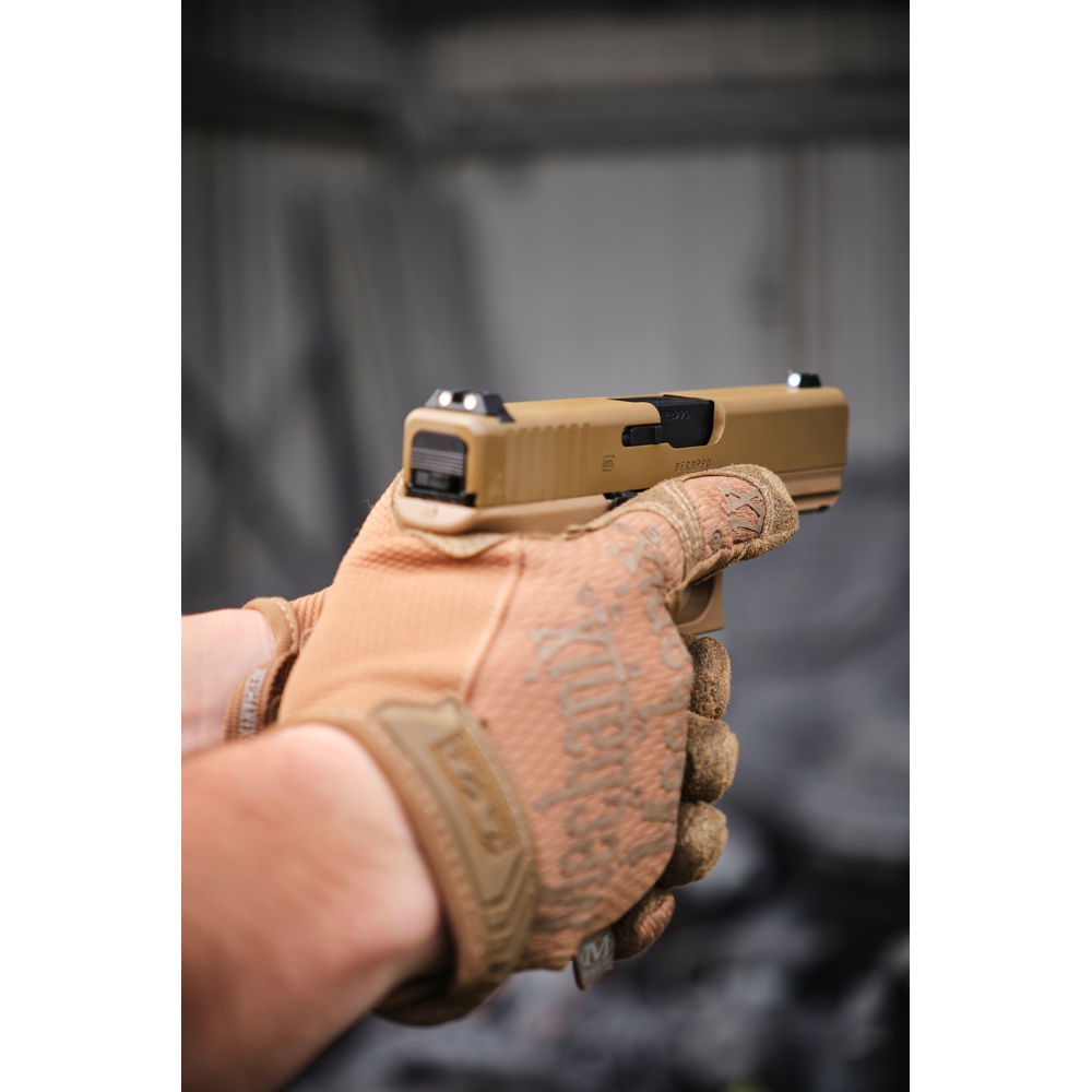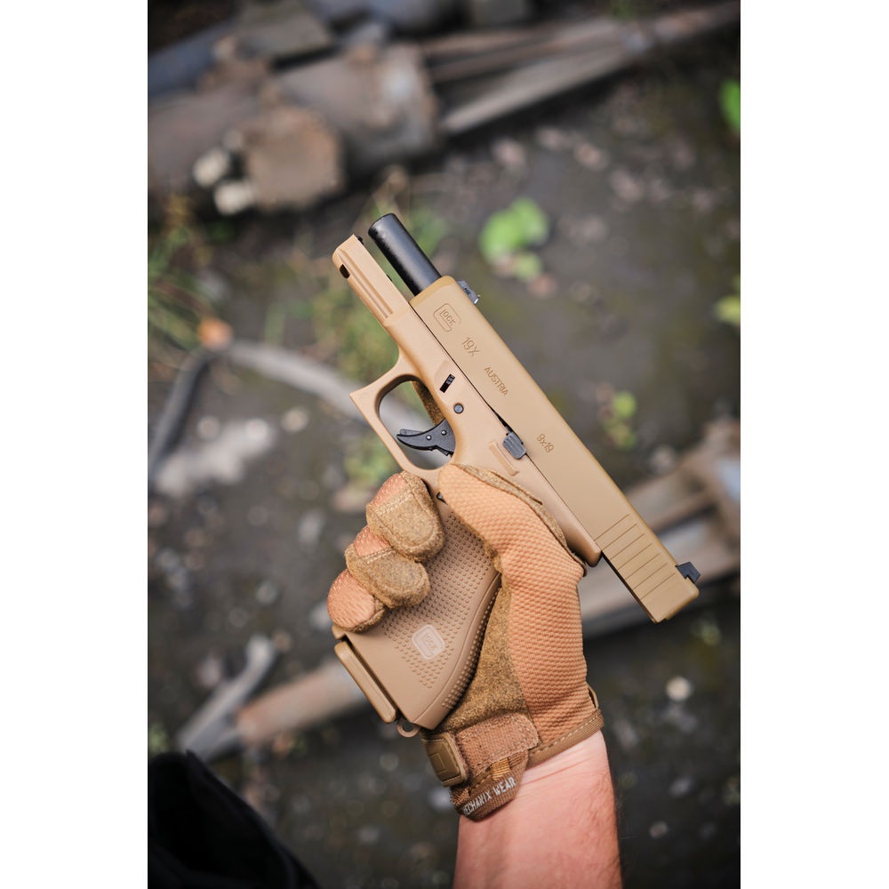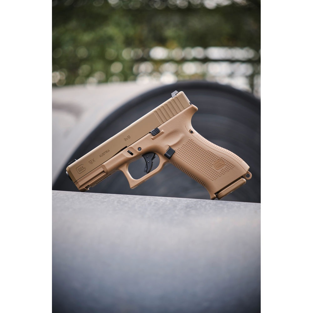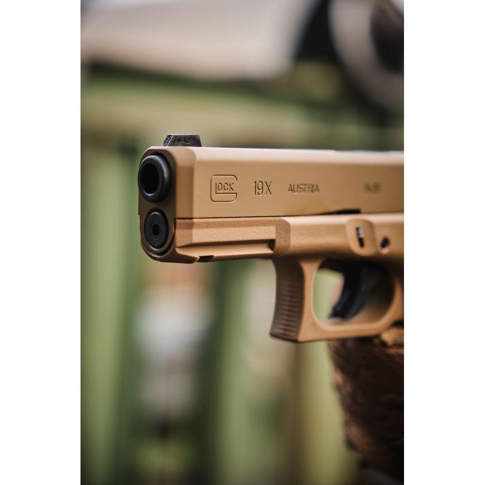 GLOCK selbst bezeichnet ihre G19X als die erste „Crossover-Pistole“ aus ihrem Hause. Hier trifft das Full-Size-Griffstück der G17 auf den kompakten Schlitten der G19. Neu dazu kam der Coyote-Farbton, der die Pistole von anderen Polymer-Modellen abhebt.
