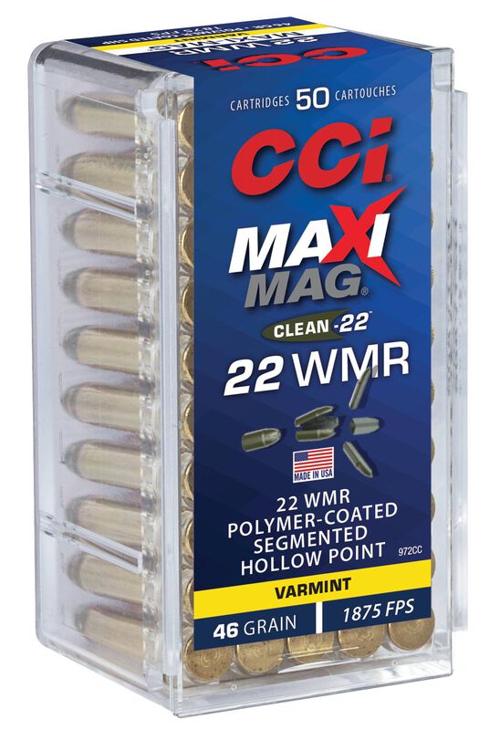 Die Clean-22-Beschichtungstechnologie erhöht jetzt die Reichweite und Leistung des 22 WMR. Maxi-Mag Segmented HP nutzt die exklusive Polymer-Geschossbeschichtung, um Kupfer- und Bleiablagerungen im Lauf deutlich zu reduzieren – ohne Rückstände zu hinterlassen. Die segmentierte Hohlspitze zerteilt sich beim Aufprall in drei gleich große Teile, wodurch sich die Anzahl der Schusskanäle verdreifacht. Die Polymerbeschichtung ermöglicht diese Trennung bei deutlich geringeren Geschwindigkeiten und größeren Entfernungen als ein herkömmlicher Kupfermantel. Die Gesamtgeometrie des Geschosses ist auf Präzision optimiert, und die zuverlässige CCI-Zündung und das Treibmittel sorgen für einen reibungslosen Lauf mit halbautomatischen Waffen und allen 22 WMR-Waffen.