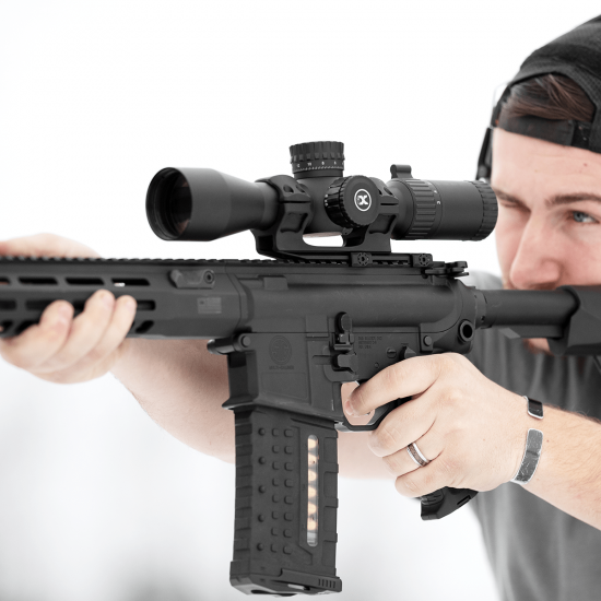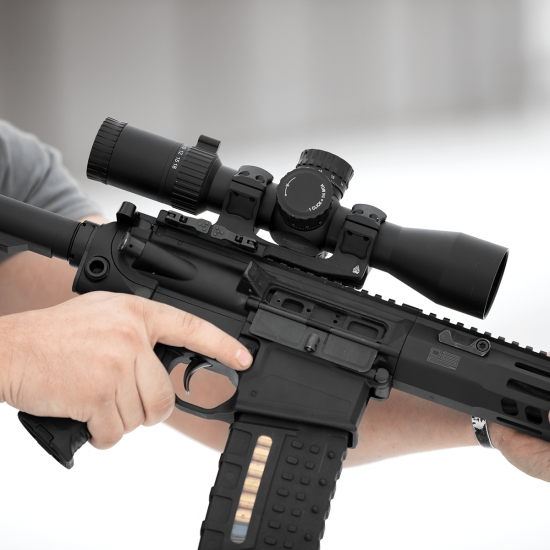 Schnellspanner (QR)-Halterung mit werkzeugloser Spannungseinstellung, arretierbaren QR-Hebeln und quadratischen Rückstoßstopps für sicheres Halten der Nullstellung und Rückkehr zur Nullstellung