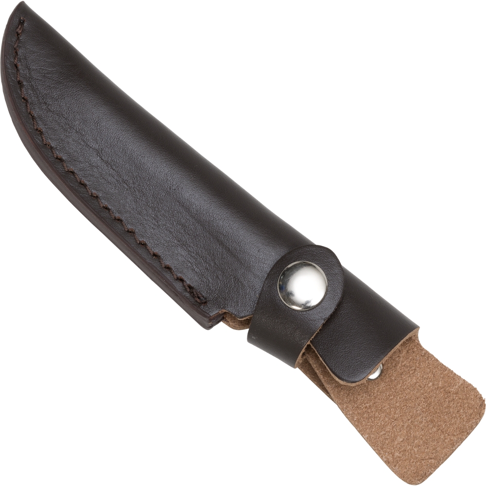 - Auf die komplett durchgehende Flachangelklinge aus rostfreiem Stahl ist die Griffbeschalung aus Wurzelholz aufgenietet.