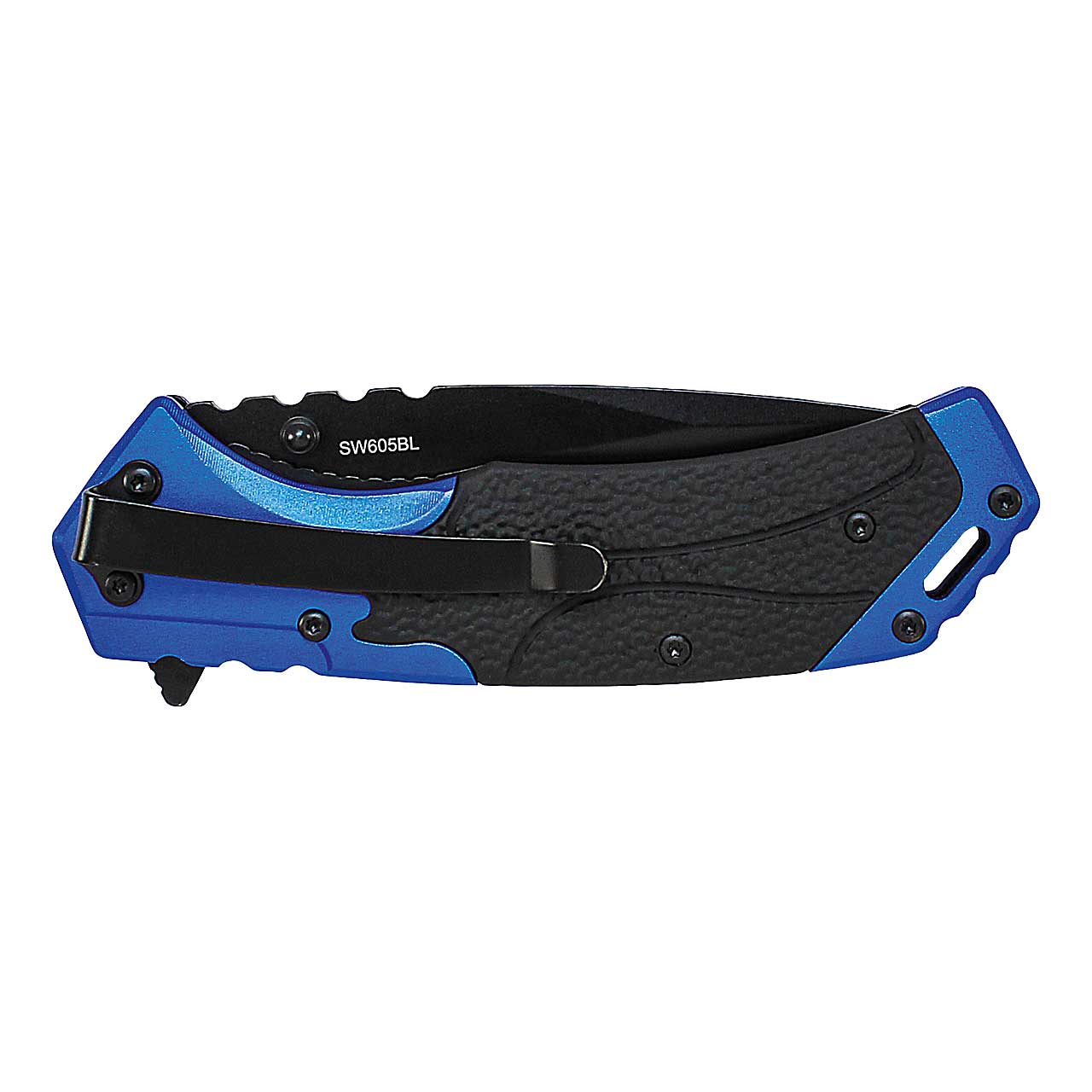 Schnell einsatzbereit ist dieses Smith & Wesson Einhandmesser durch die beidseitig angebrachten Daumenpins in Kombination mit einem Flipper. Die rutschhemmende Ausarbeitung der blau/schwarzen Aluminium Griffschalen sorgt für ein sicheres Handling. Ein Liner Lock verhindert das unbeabsichtigte Einklappen der schwarzen, rostfreien Klinge aus High Carbon Stahl 8 CR 13MoV. Eine besondere Note erhält das Messer durch die leuchtend blauen Elemente der Beschalung. Zur Befestigung am Gürtel ist das Messer mit einem Clip versehen.