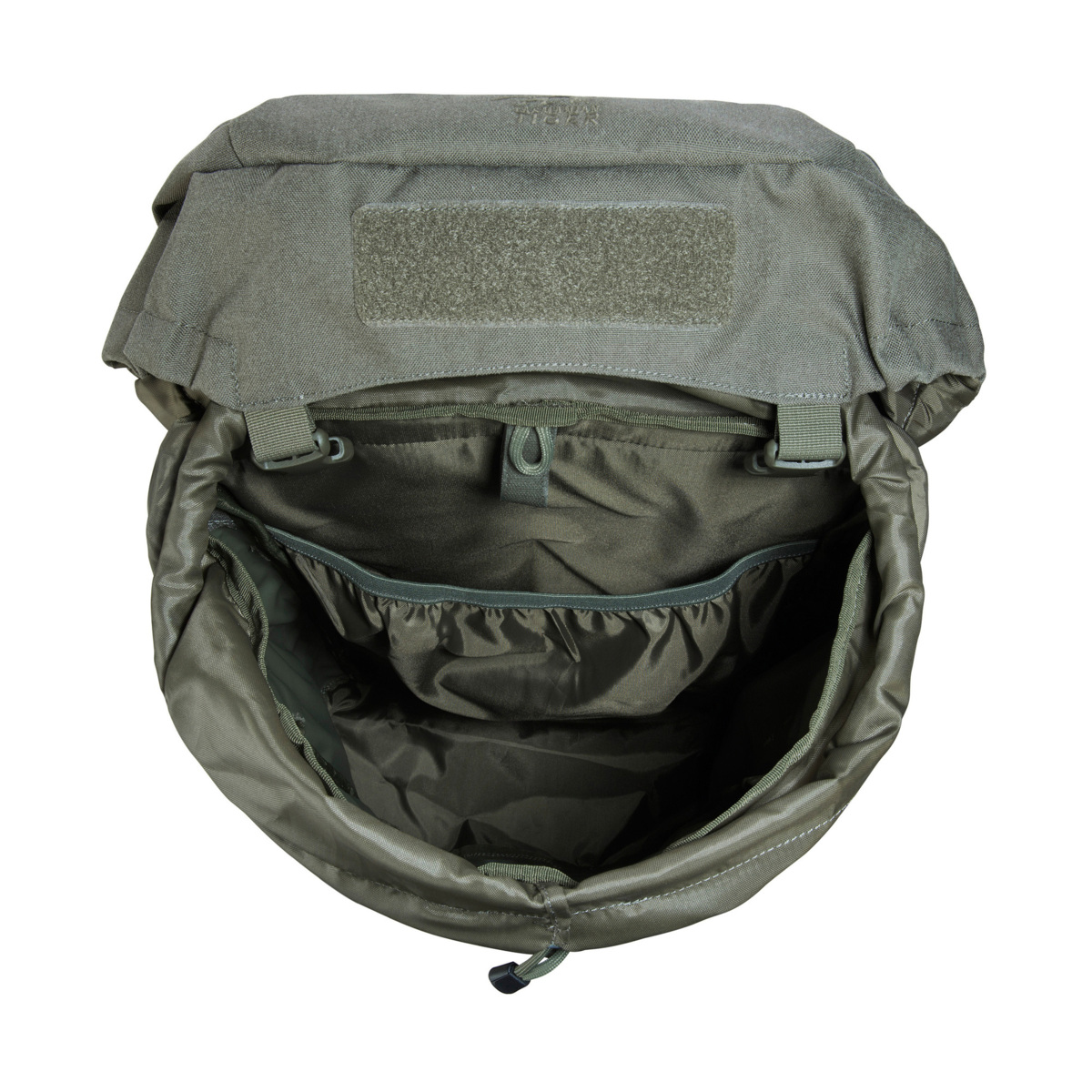 Der TT Mil Ops Pack 30 IRR verfügt über ein MOLLE-System und ein Schnürsystem auf der Front, Kompressionsriemen sowie zwei seitliche Einstecktaschen. Zudem bietet er eine Trinksystemvorbereitung. Im Deckel befindet sich ein Deckelfach mit Reißverschluss.
