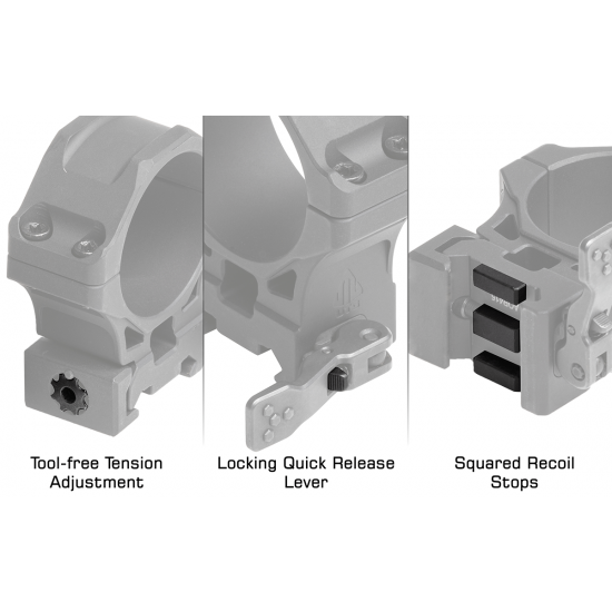 Die Schnellspannhalterung (QR) bietet werkzeuglose Spannungseinstellung, einen Schnellspannhebel mit Feststellfunktion und quadratische Rückstoßstopps für sicheres Halten der Nullstellung und Rückkehr auf Null
