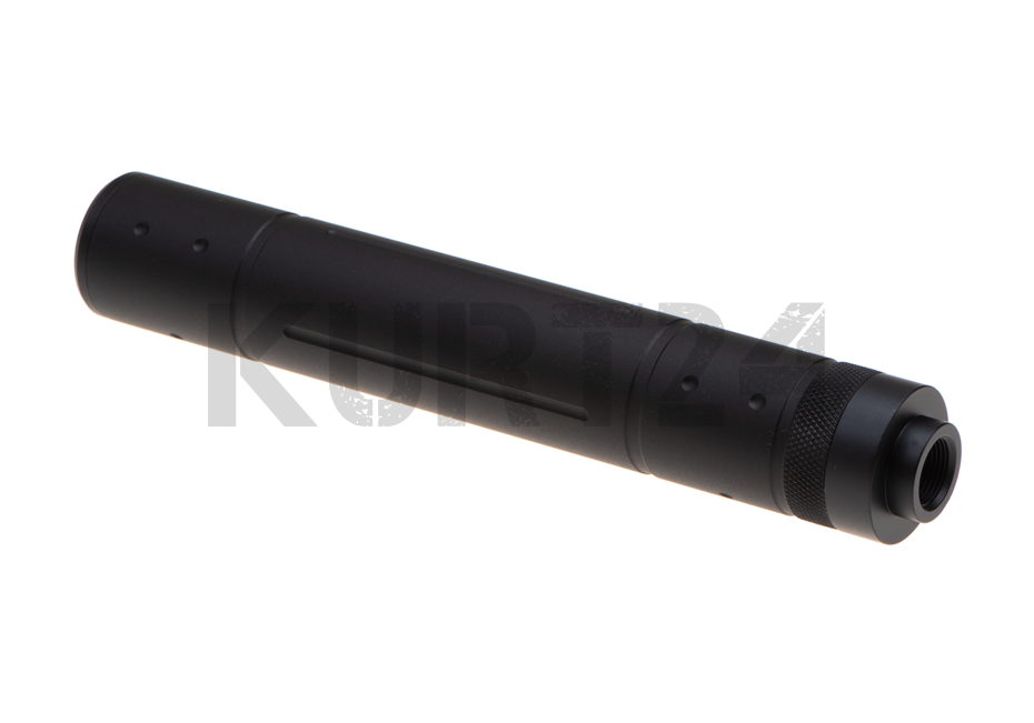 Beschreibung: Robuster und schön verarbeiteter Schalldämpfer aus Aluminium, passend zu 14 mm CCW Gewinden. Im Gegensatz zu anderem Schalldämpfer sehr resistent auf mechanische Einwirkungen. Erzielt keine schalldämpfende Wirkung, darf aufgrund der Großen Unfallgefahr (Querschläger etc) auf keinen Fall mit Schusswaffen verwendet werden! Produktspezifikation: Durchmesser: 38mm Länge: 158 mm Gesamtlänge: 160 mm Durchmesser: 38 mm Gewinde: 14mm CCW