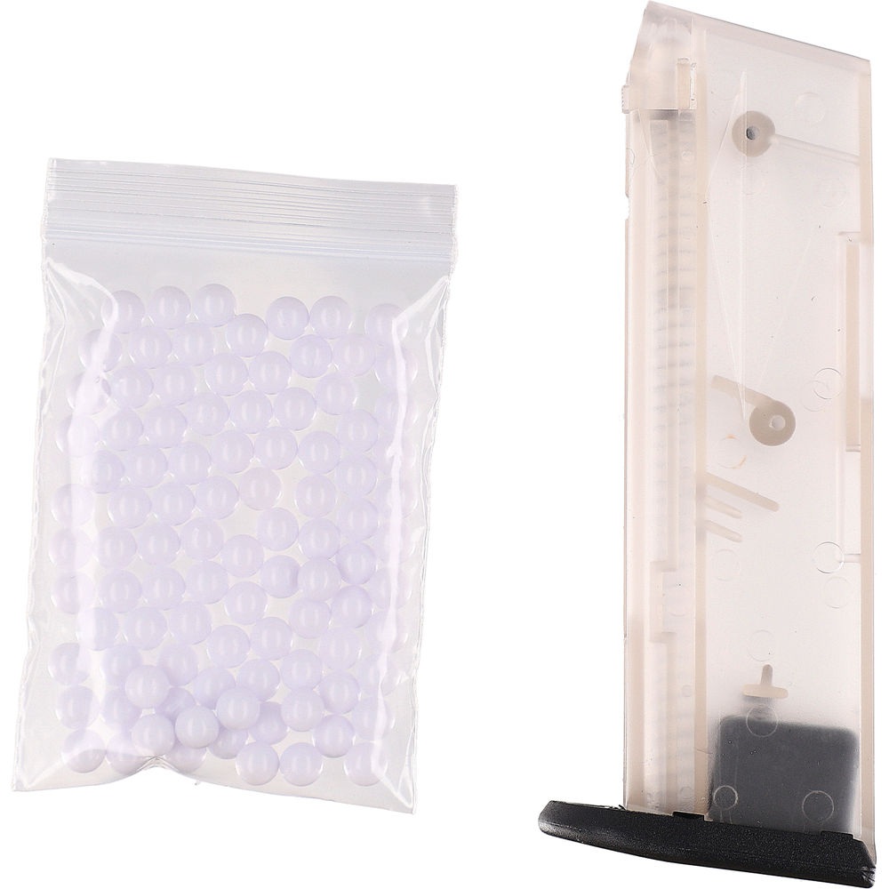 Airsoft Federdruck-Variante der Walther Dienstpistole mit Metallschlitten. Lieferung mit schwerem Magazin (14 Schuss), HiCap-Magazin (100 Schuss) und 100 BBs.