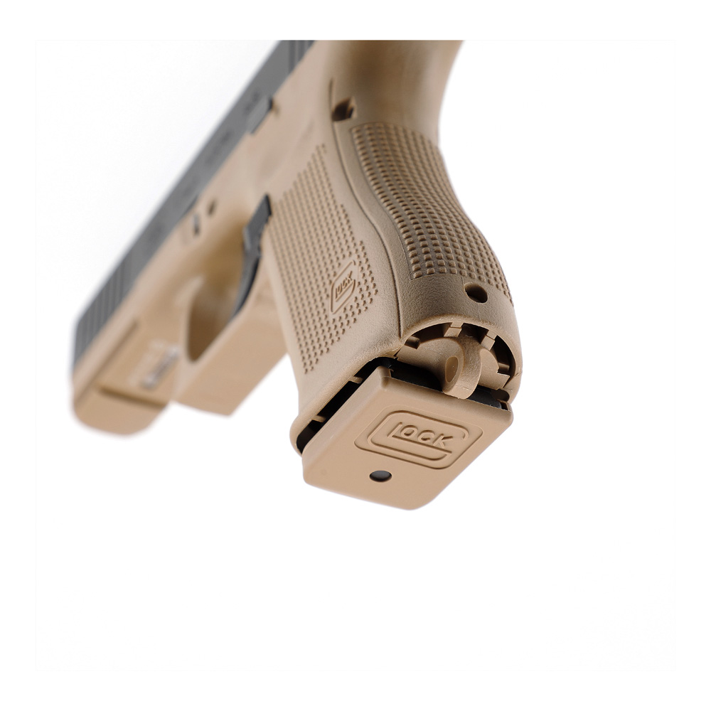 Für ein authentisches Spielerlebnis erzeugt das Blowback einen deutlich spürbaren Rückstoß, wenn der schwere Metallschlitten der gasbetriebenen GLOCK bei jedem Schuss zurückschnellt. Das 22-schüssige Magazin ist im Coyote-Farbton des Griffstücks gehalten.
