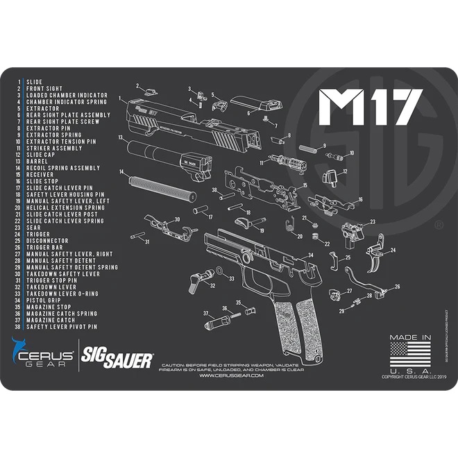 Beschreibung: Die einzige M17-Reinigungsmatte, die von SIG SAUER empfohlen, unterstützt und offiziell lizenziert wurde. Sehen Sie sich jede Komponente der offiziellen Dienstpistole der US-Armee an, seien Sie zuversichtlich in ihrer Genauigkeit und erweitern Sie Ihr Wissen über diese Schusswaffe. Holen Sie sich noch heute Ihren exklusiven ProMat. Dieser Schaltplan funktioniert für den M17 und den M17-Commemorative. Produktspezifikation: Leichte, strapazierfähige Reinigungsmatte ist die perfekte Ergänzung für Ihre Waffe. Geräumiger 12" x 17" (30,48cm x 43,18cm) gepolsterter Arbeitsbereich. Rutschfeste strukturierte Gummibasis schützt Ihre Arbeitsfläche. Hergestellt aus 1/8 "(3mm) vulkanisiertem Gummi mit einem weichen, wärmegebundenen Polyester schützt Ihre Waffe vor Kratzern. Farbsublimationsdruck verschleißt oder reibt nicht ab. Lösungsmittel- und ölbeständig. Lebenslange Garantie. Entwickelt und gedruckt in den USA! Aufbewahren Ihrer ProMat: Aufrollbar für eine einfache und kompakte Aufbewahrung. Rollmatte, mit der Bildseite nach innen. Passt problemlos in Ihre Range Bag, Waffentresor oder andere Aufbewahrungsorte. Reinigung Ihrer ProMat: Empfohlen: Handwäsche. Mit warmem Wasser abspülen, mildes Spülmittel auftragen, mit den Fingern rühren und aufschäumen oder das obere Tuch aneinander reiben, mit warmem Wasser abspülen und an der Luft trocknen.