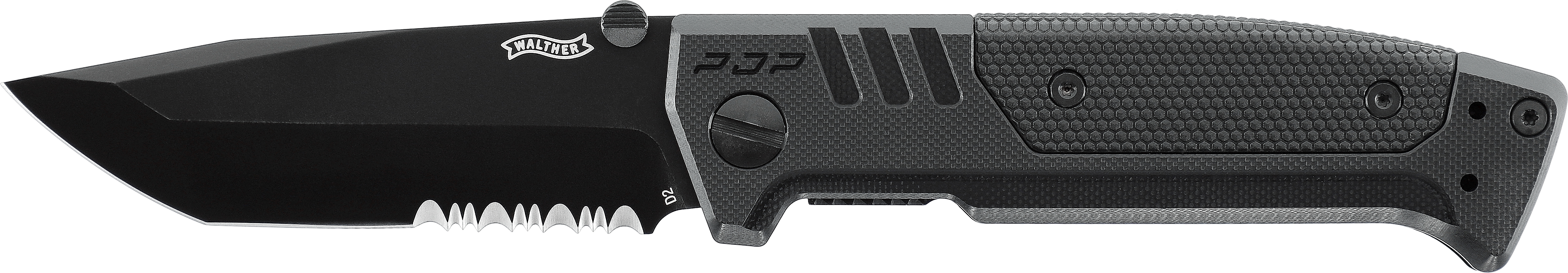 Das Herzstück des Messers ist die beschichtete Tanto-Klinge mit Teilwellenschliff aus überaus schnitthaltigem D2. Mit diesem Stahl, einer Länge von 92 mm und einer Stärke von 3,6 mm eignet sie sich für anspruchsvolle Aufgaben im Alltag, Einsatz oder bei Outdoor-Aktivitäten. Sie verriegelt per Edelstahl-Linerlock und wird über den beidseitigen, abnehmbaren Daumenknopf geöffnet. Die Öffnungshilfe ist dem Magazinhalter der Walther PDP-Pistole nachempfunden.