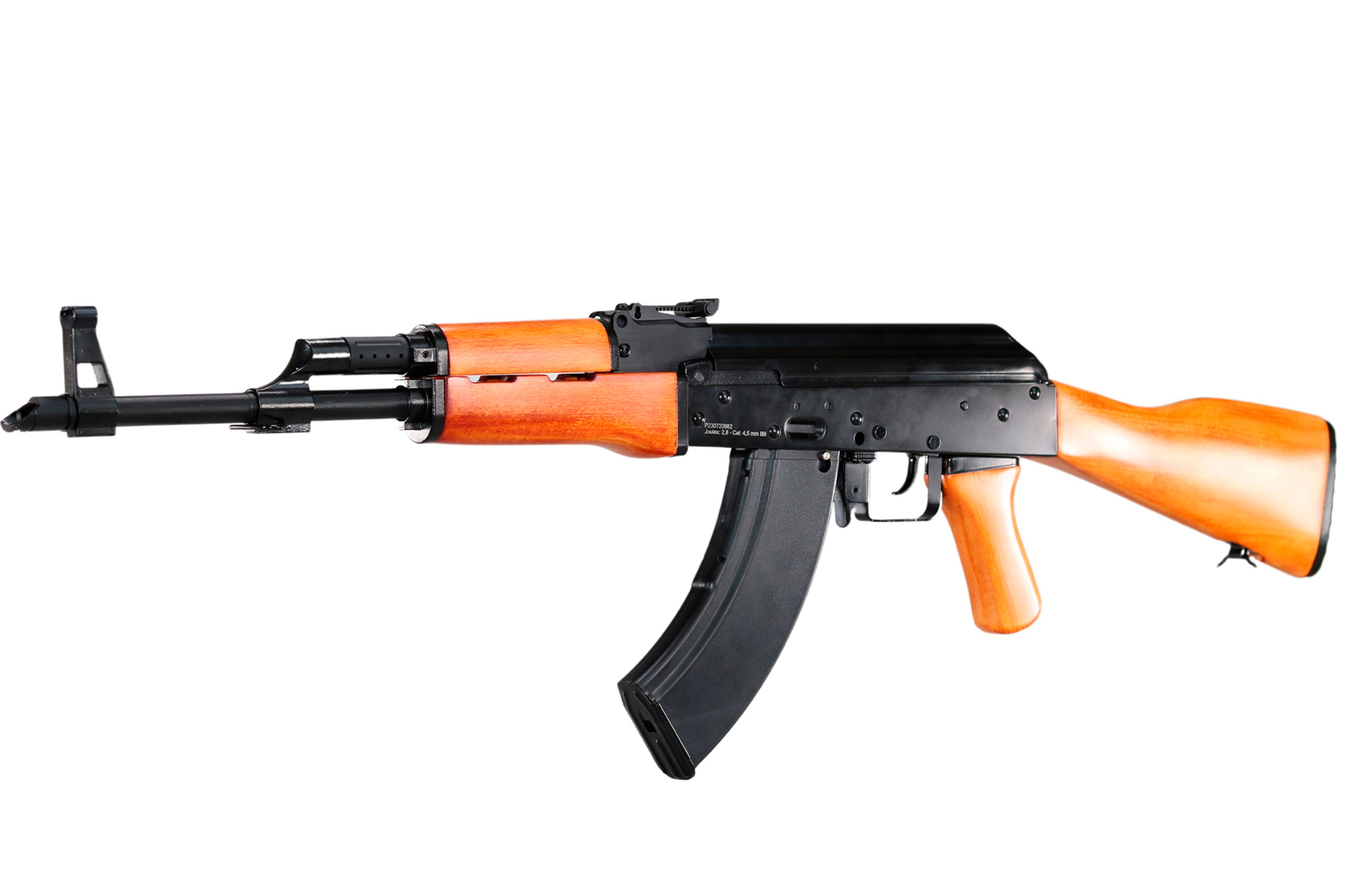 Michail Timofejewitsch Kalaschnikow entwickelte dieses sowjetisch-russische Sturmgewehr. Seit 1947 rüsten mehr als 60 Staaten Ihre Armeen mit diesem Gewehr aus. Mit ihren 80 bis 100 Mio. Stück handelt es sich bei diesem Klassiker um die meistproduzierte Handfeuerwaffe weltweit. Der detailgetreue Nachbau besteht aus einem Vollmetall-Body und einem Schaft und Handschutz aus Holz. Das Gewehr verschießt 4,5-mm-Stahlkugeln und wird mit Co2 betrieben. Die hinetere Visierung ist höhenverstellbar. Kaliber: 4,5 mm BB System: Co2 Munitionstyp: BBs Magazinkapazität: 18 Schuss Abzug: Single-Action Material: Vollmetall Farbe: Schwarz Sicherung: Abzugssicherung Gewicht: 3.050 g Gesamtlänge: 900 mm Energie: ca. 2,7 Joule Luftdruckwaffen (Luftpistolen und Luftgewehre unter 7,5 Joule) müssen eine -F- Kennzeichnung im Fünfeck haben. Der Erwerb, Besitz und Transport der Waffen ist Volljährigen ohne Waffenschein erlaubt. Sie unterliegen jedoch dem Führverbot (§42 a WaffG).