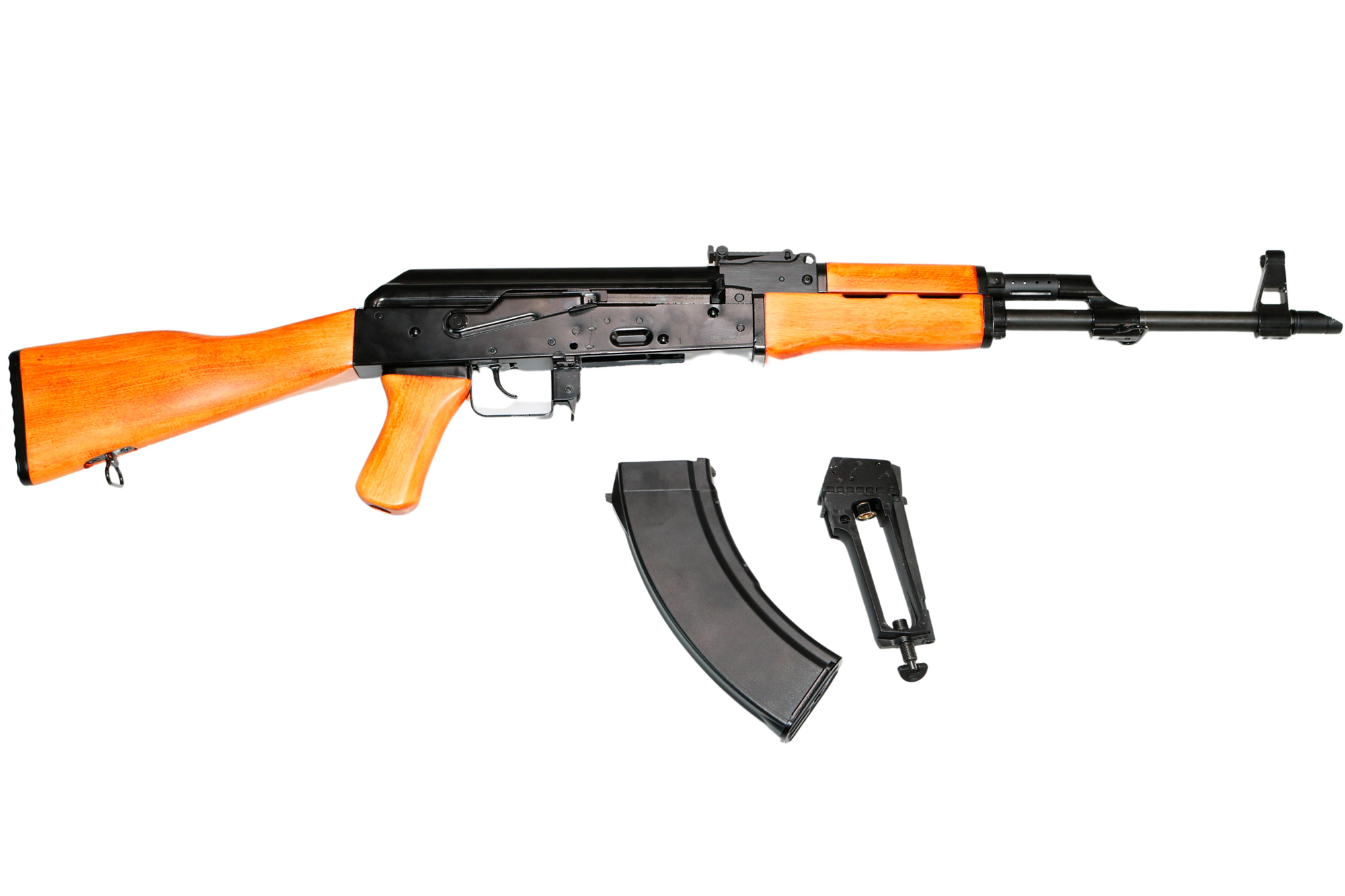 Originales Kalashnikow Sturmgewehr AK47 AKM mit CO2 Magazin und Lauf 4,5mm. Diese CO2-Waffe verschießt 4,5mm Stahlrundkugeln, besteht komplett aus Stahl und ebenso wie das Originalgewehr zerlegbar. Die Waffe hat typisch Russische robuste waffenartige Fertigungsspuren Aus original Teilen (95%) gebaute Ganzstahlwaffe mit Gewehrnummer und Holzschäftung Jede Waffe ist ein Unikat Produktspezifikation: Modellbezeichnung: AK47 AKM 56-2 CO2 YUNKER mit F-Zeichen Ganzstahl mit Werkswaffennummer. System: CO2 Mehrlader, semiauto. Antrieb: 12 g CO2-Kapsel. Kaliber: 4,5 mm BB (Stahlrundkugeln). Magazinkapazität: 18 Schuss. Gasverbrauch: ca. 80 gut brauchbare Schüsse/Kapsel. Mündungsenergie bis max.: 7,5 Joule. Gewicht: ca. 3900g. China Norinco Holzschäftung Double-Action-System. Kimme höhenverstellbar. Korn höhenverstellbar. Abzugssicherung über Originalhebel. Mündungsfeuerdämpfer abnehmbar (Originalgewinde CCW) Hersteller-Info: Russland