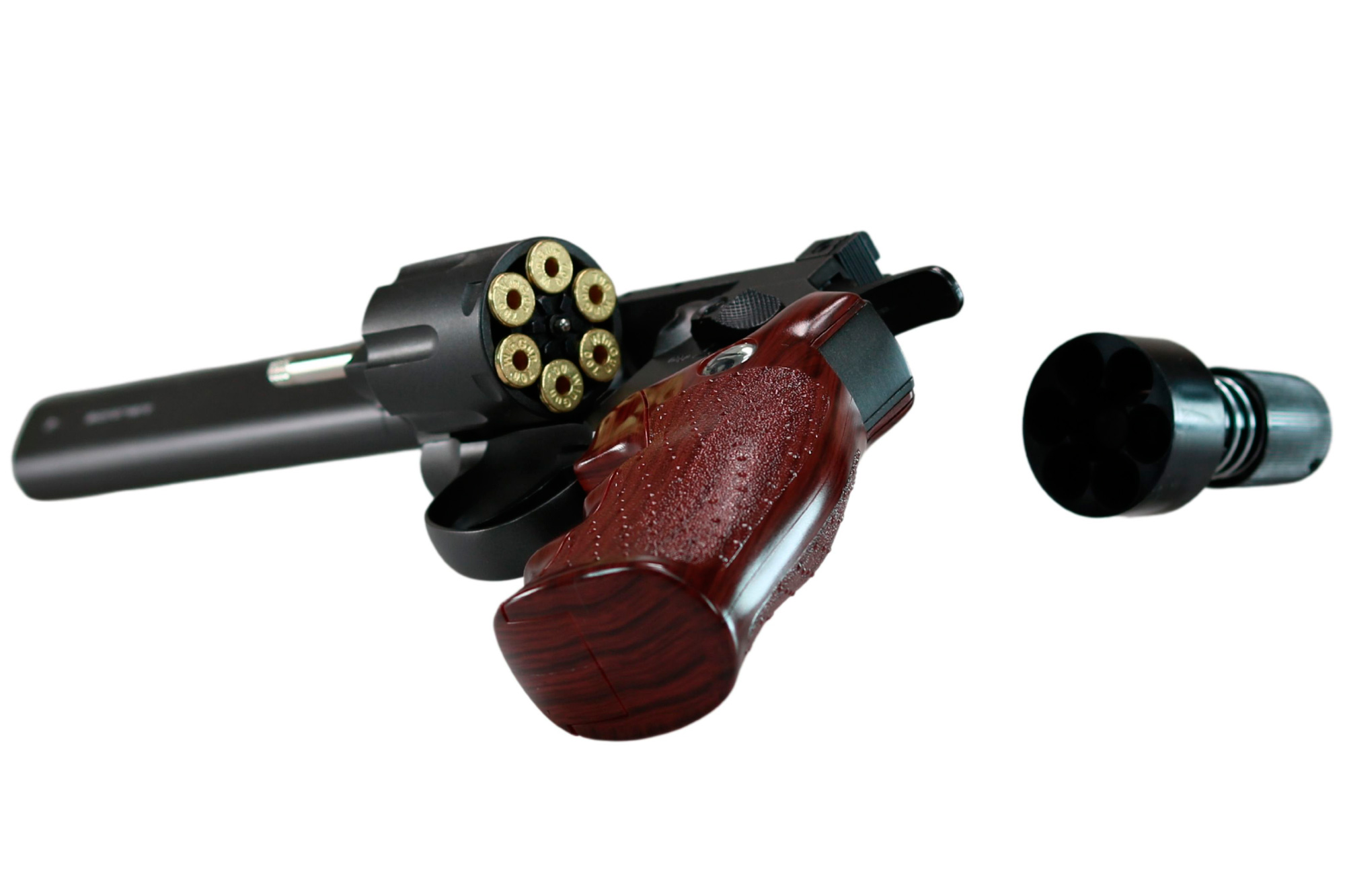 Einer der Bestseller ist der stupsnäsige Revolver im Kaliber 9 mm R.K. Mit 5 Schuss Trommelkapazität, der Brünierung und den braunen Kunststoffgriffschalen entspricht er den klassischen Vorbildern. SA-/DA-Abzug. Mit Fallsicherung. Kaliber: 9 mm R.K. Trommelkapazität: 5 Schuss Abzug: Single / Double Action Sicherung: Fallsicherung Länge: 155 mm Gewicht: 462 g Holster-Typ: CDer Revolver wird in einem Koffer inkl. Abschussbecher, Reinigungsbürste und einer Bedienungsanleitung ausgeliefert.