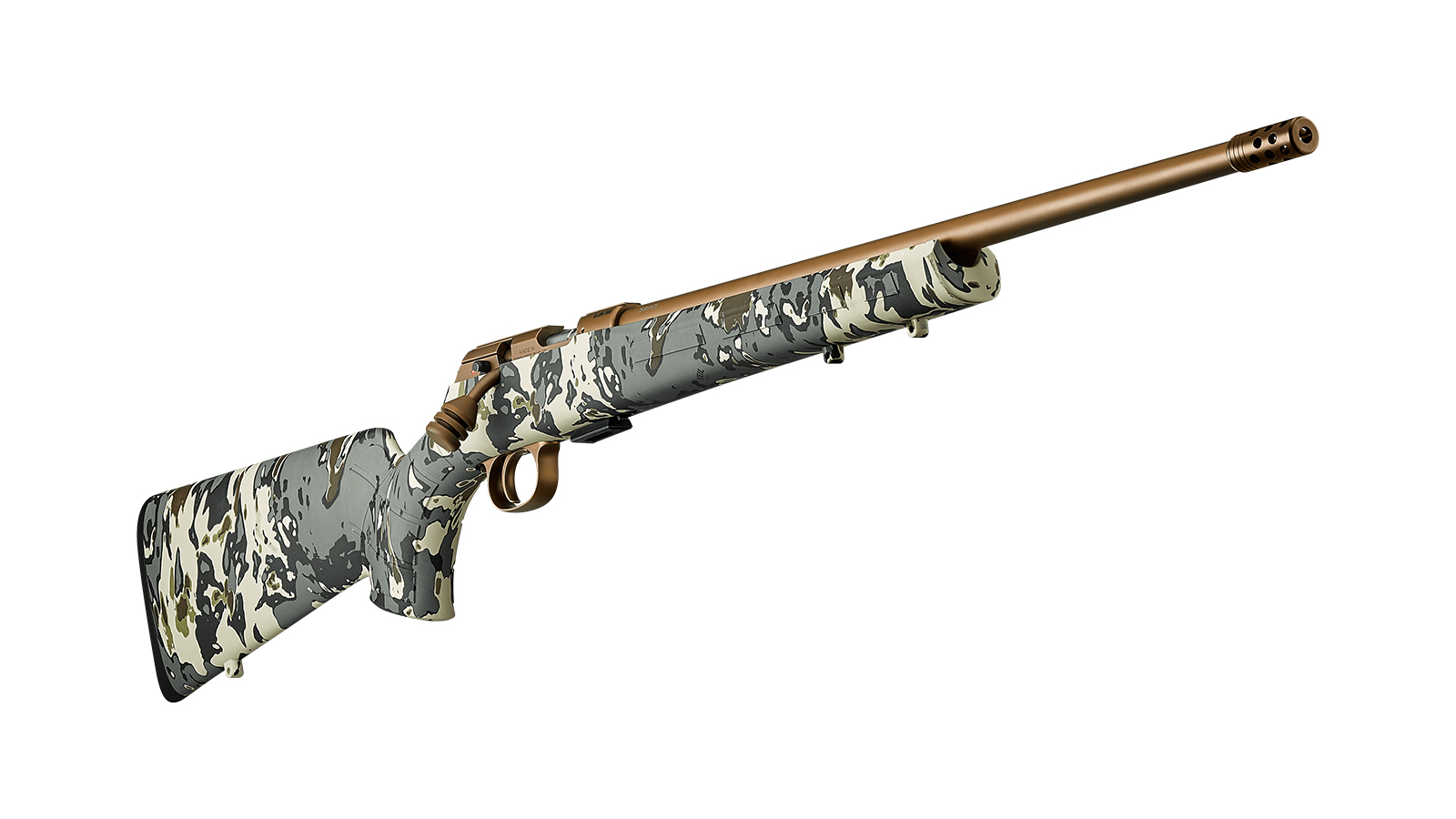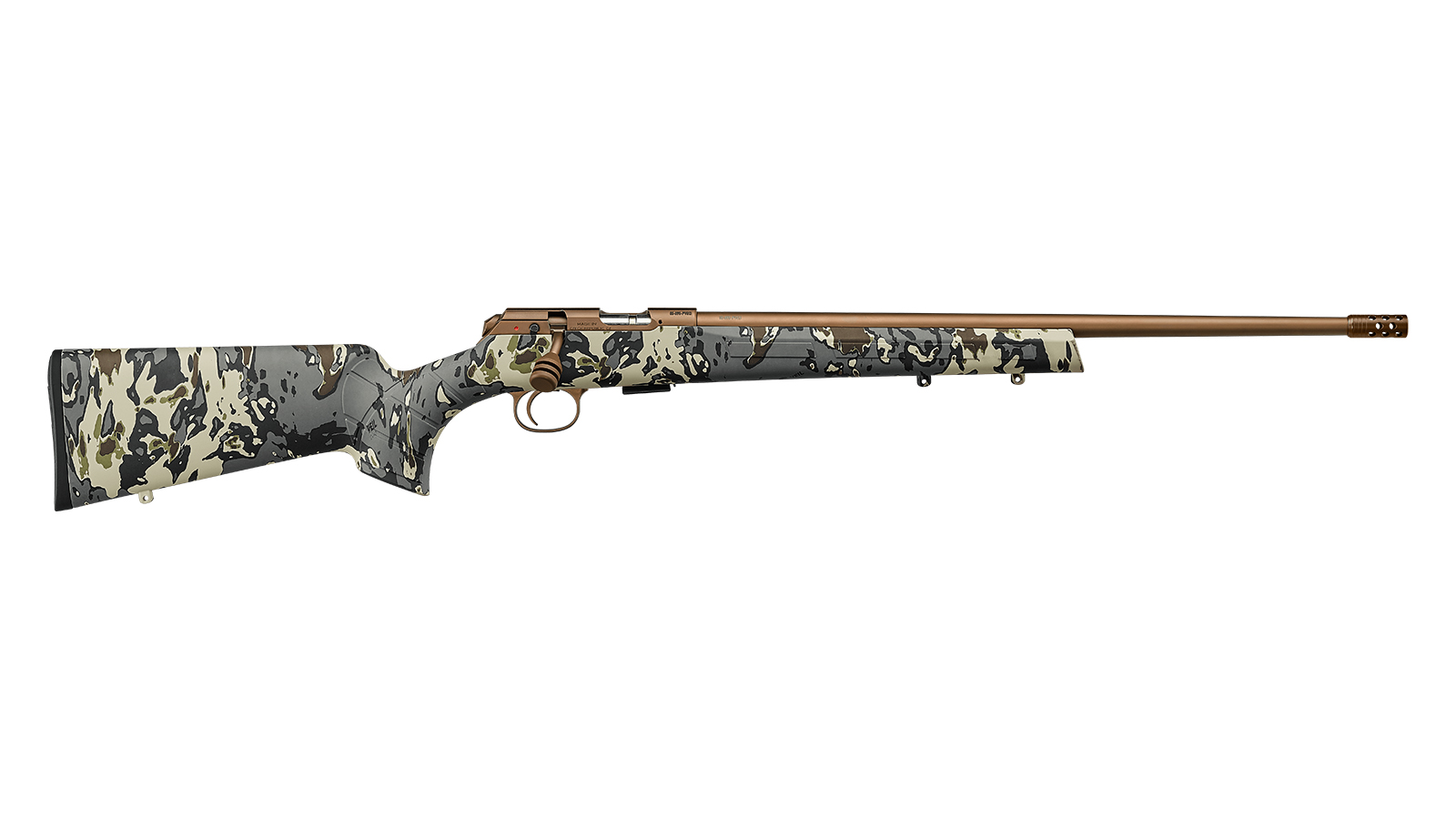 Die flache Bronzeoberfläche des 20-Zoll-Lichtprofil-Laufs und aller Metallkomponenten sowie eine hochwertige PVD-Beschichtung tragen zusätzlich dazu bei, dass sich das Gewehr harmonisch in die natürliche Umgebung einfügt und eine extreme Verschleiß- und Korrosionsbeständigkeit aufweist. Abgerundet wird die Ausstattung durch einen Kompensator zur Reduzierung des Mündungsanstiegs.