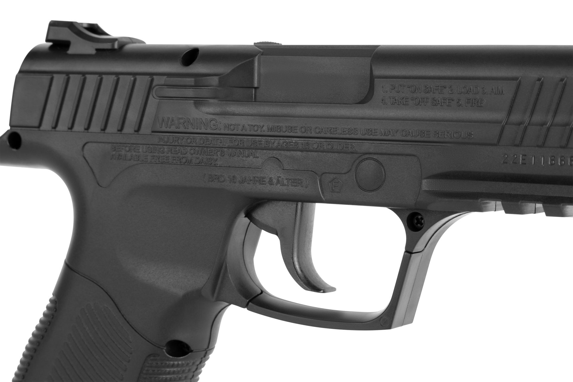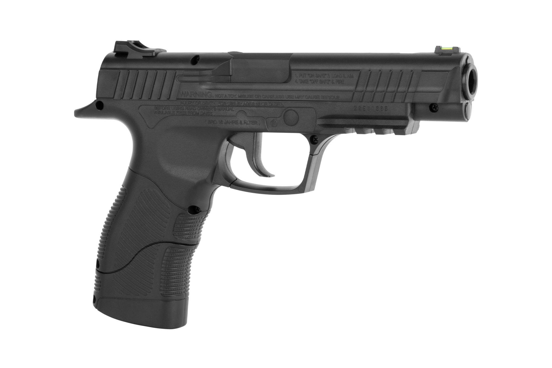 Mit der Tactical Defense Pistol 45 bietet Umarex ein Einsteigermodell für CO₂-Fans, das durch komfortables Handling und ansprechendes Design überzeugt. Mit wenigen Handgriffen wird die 12g CO₂-Kapsel ausgetauscht. Das herausnehmbare Magazin nimmt 19 Stahlrundkugeln auf und ist blitzschnell gewechselt. Die günstig positionierte Sicherung lässt sich im Anschlag bedienen, der Double Action only-Abzug ermöglicht schnelle Schussfolgen. Zur Aufnahme von Zubehör ist das Griffstück der T·D·P·45 mit einer Picatinny-Schiene versehen. Ebenso unschlagbar wie Bedienkomfort und Ausstattung ist das Preis-Leistungs-Verhältnis dieser eleganten CO₂-Pistole. Energiestufe (E₀): < 3,0 J Geschossgeschwindigkeit (V₀): 120 m/s (394 fps) Kaliber: 4,5 mm (.177) BB Antrieb: 1x 12 g CO₂ Magazinkapazität: 19 Schuss Schusskapazität: 190 Schuss Abzug: Double Action Only Sicherung: Schiebesicherung Länge: 165 mm Gewicht: 455 g Holster-Typ: A