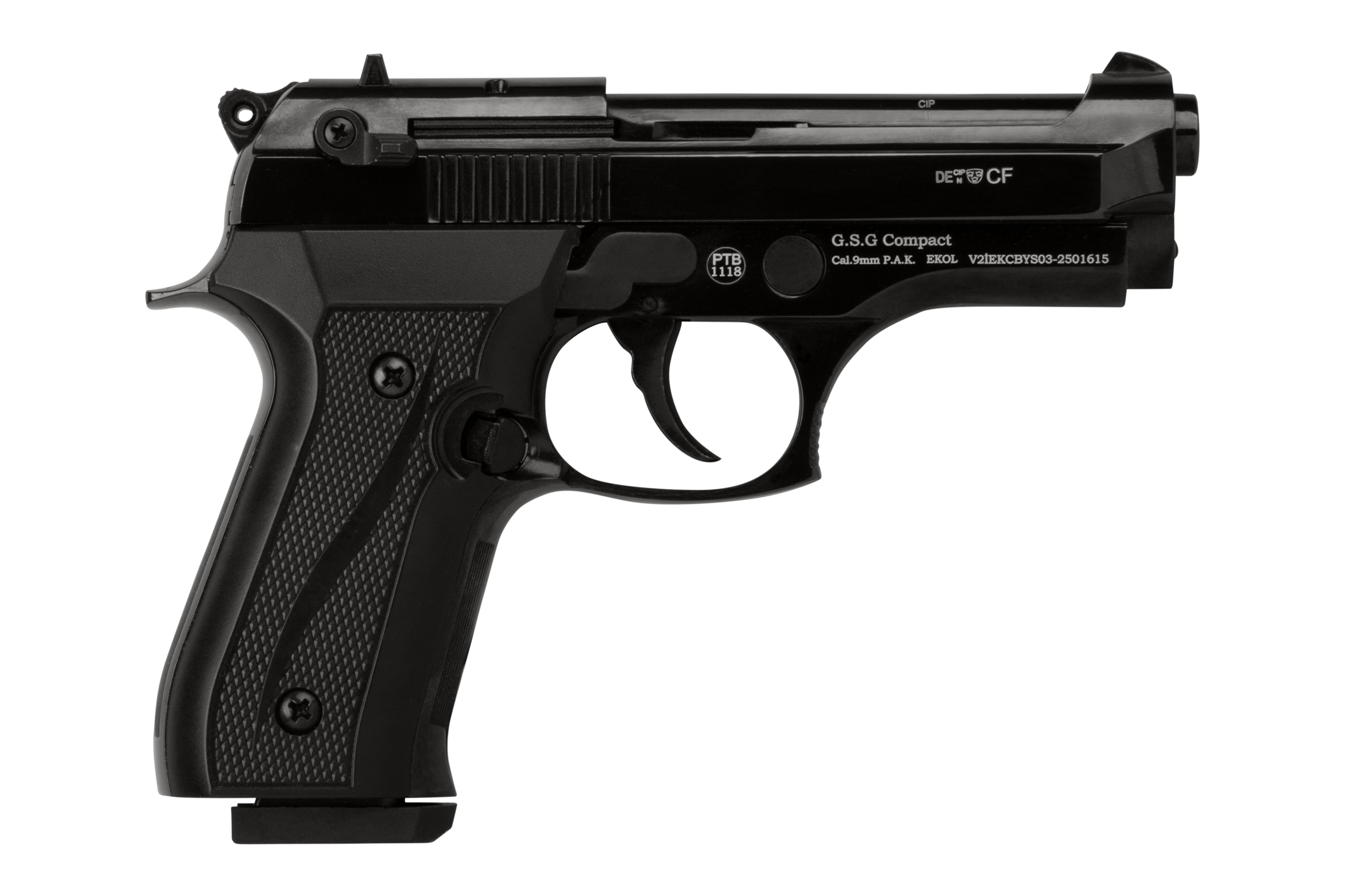 Kompaktes Design mit innenliegendem Hammer Doppelreihiges Magazin mit hoher Kapazität Polymer-Griffstück mit ausgeprägten Gripzones und perfekter Ergonomie Weaver-Schiene zur Zubehörmontage Produktspezifikation: Kaliber: 9mm P.A.K. Magazinkapazität: 14 Schuss Abzug: Single Action Sicherung: Schwenksicherung Länge: 181 mm Gewicht: 795 g Holster-Typ: A, E Brünierter Schlitten mit verlängertem Stahl-Stoßboden und griffigen Durchladerillen Die Pistole wird im Koffer inkl. Abschussbecher, Reinigungsbürste und einer Bedienungsanleitung ausgeliefert.