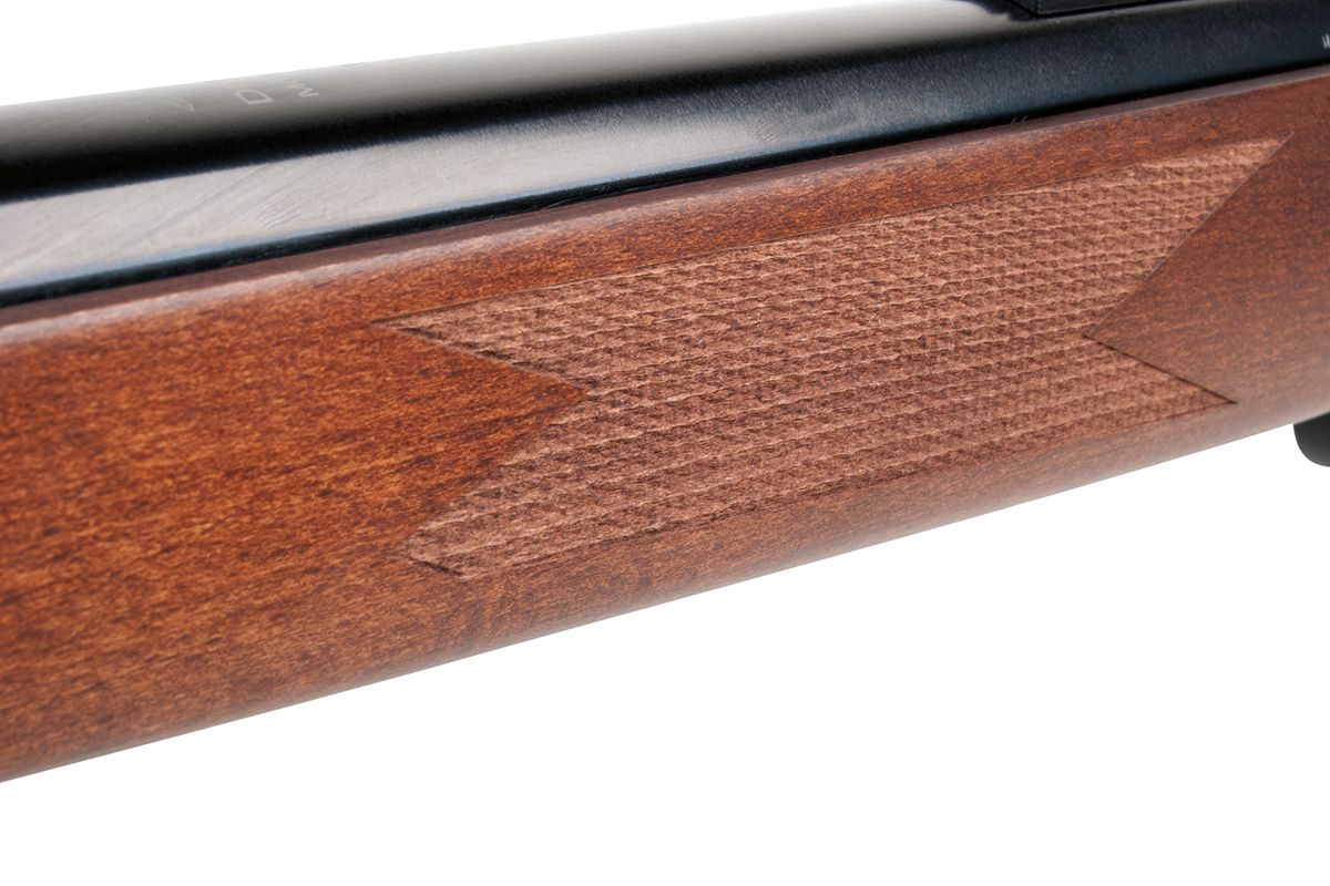Qualität made in Germany. Bewährtes Sport- und Freizeitluftgewehr, kompakt und handlich. Tunnelkornfuß mit Wechselkornblättern, fein einstellbarem Mikrometervisier mit vier verschiedenen Kimmenausschnitten, automatischer Sicherung, fein einstellbarem Matchabzug „Rekord“. Führiger, nussbaumfarbig gebeizter Buchenschaft mit Fischhaut und Backe, mit Gummischaftkappe. Lauf: 410 mm System: Kipplauf mit Federbolzenverschluss Visier: verstellbares Mikrometervisier, Tunnelkornfuß, Wechselkorne Ausführung: schwarz brüniert, Prismenschiene, automatische Abzugs-Druckknopfsicherung Abzug: Matchabzug Rekord Schaft: Buche mit M.C. Backe, Gummischaftkappe, Fischhaut am Pistolengriff. Gesamtlänge: 1.075 mm Gewicht: 3,5 kg Energie: max. 7,5 Joule Kaliber: 4,5mm
