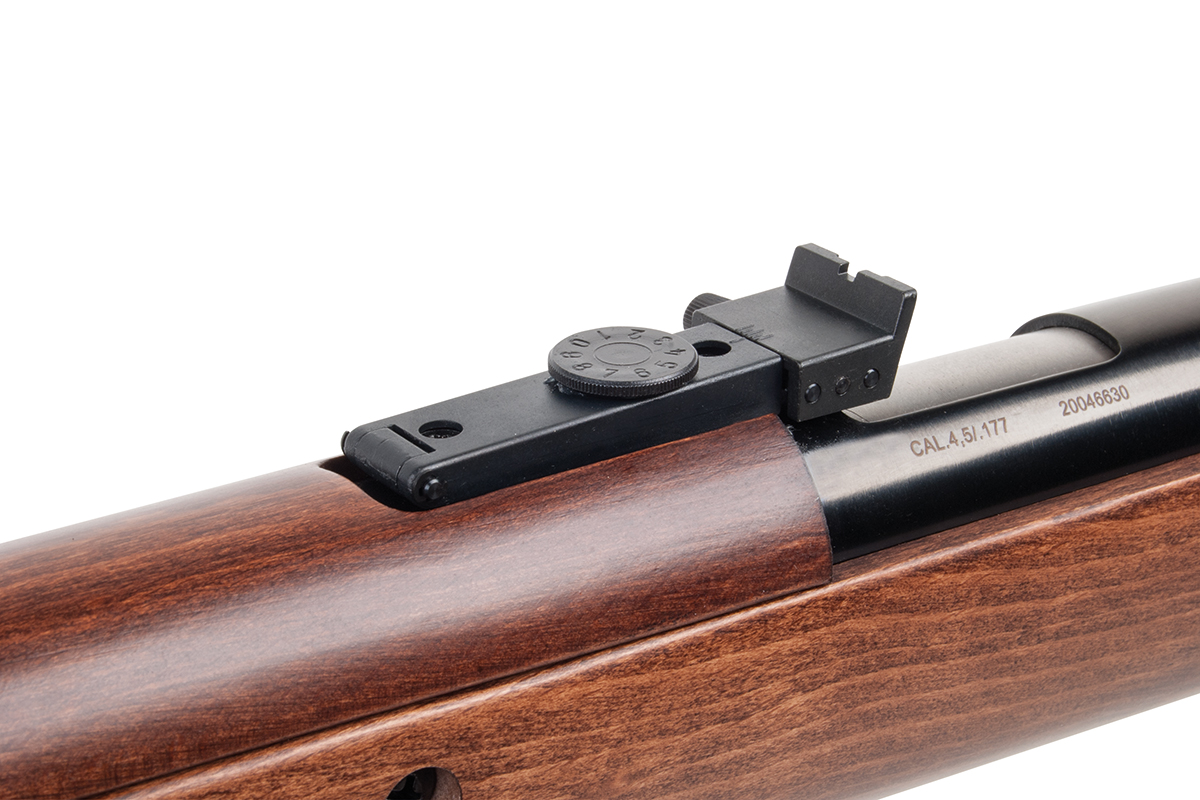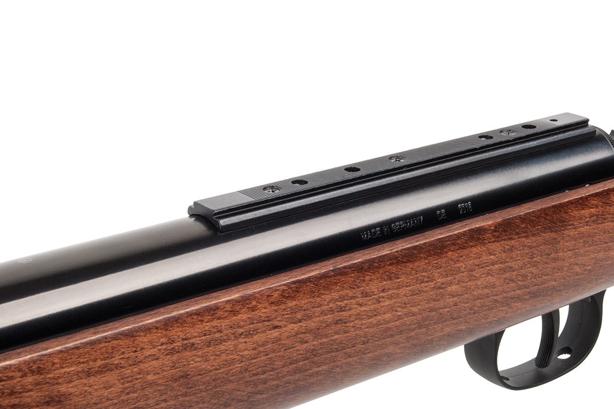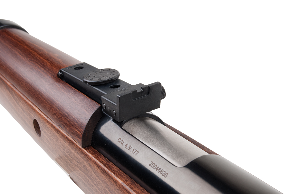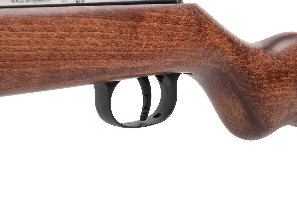 Ein preisgünstiges Luftgewehr für Hobby und Sport mit Unterspannhebel-Technik. Einschüssig, mit Ladetor. Handlich und gut ausbalanciert. Automatische Sicherung, fein einstellbarer Matchabzug „Rekord“, höhen- und seitenverstellbares Mikrometervisier mit vier verschiedenen Kimmenausschnitten, langer, führiger Buchenschaft mit beidseitiger Backe, Punzierung am Pistolengriff und Vorderschaft, für Rechts- und Linkshänder, Gummischaftkappe. (Lieferung ohne Zielfernrohr.) Lauf: 360 mm System: Unterspannhebel Visier: verstellbares Mikrometervisier, Sattelkorn Ausführung: schwarz brüniert, Prismenschiene, automatische Abzugsdruckknopfsicherung, Abzug: Matchabzug Rekord Schaft: Buche mit beidseitiger Backe, Fischhaut, Gummischaftkappe. Gesamtlänge: 1.020 mm Gewicht: 3,2 kg Energie: max. 7,5 Joule Kal.: 4,5mm