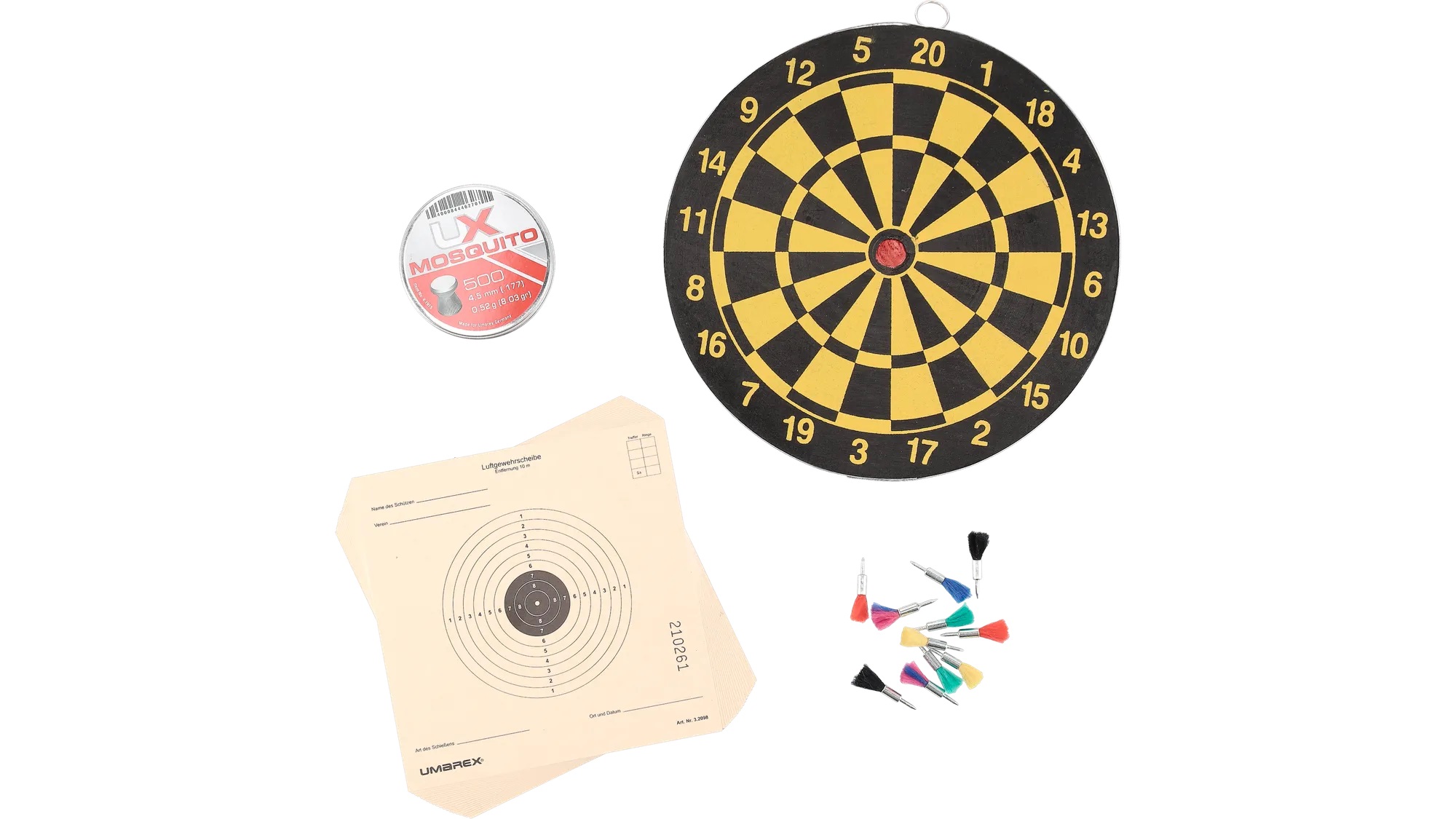 Im Lieferumfang für das Set sind neben einem 4 x 15 Zielfernrohr und einer Dartscheibe zusätzlich noch Federbolzen sowie 500 Diabolos und Zielscheiben enthalten.