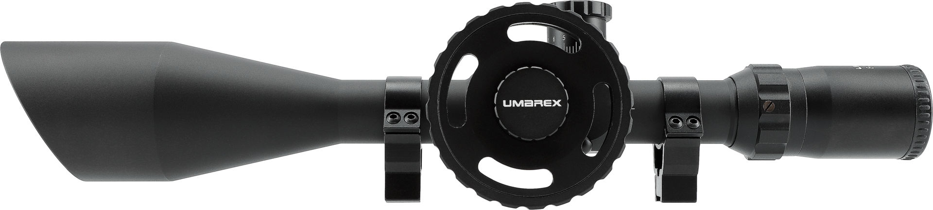 Parallaxeausgleich mit großem Schnellstellrad, großer und breiter Verstellbereich des Absehens durch hohe Türme, angewinkeltes Objektiv für ein reflektionsfreies Zielbild