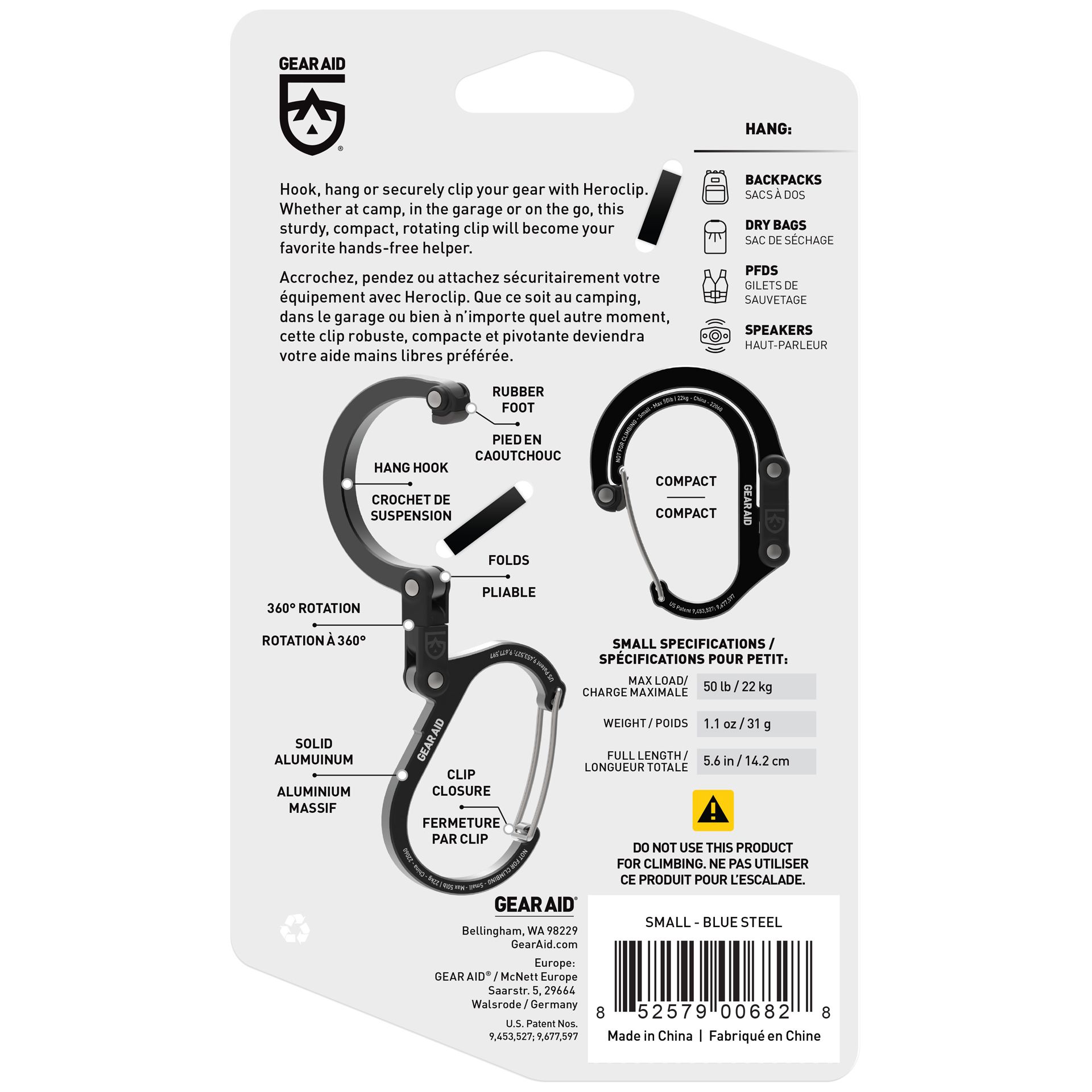 Sie können Ihre Ausrüstung mit dem 'Heroclip' einhaken, aufhängen und sicher befestigen. Ob im Camp, in der Garage oder unterwegs, dieser robuste, kompakte, 360° drehbare Clip wird zu Ihrem bevorzugten Helfer um die Hände frei zu haben.
