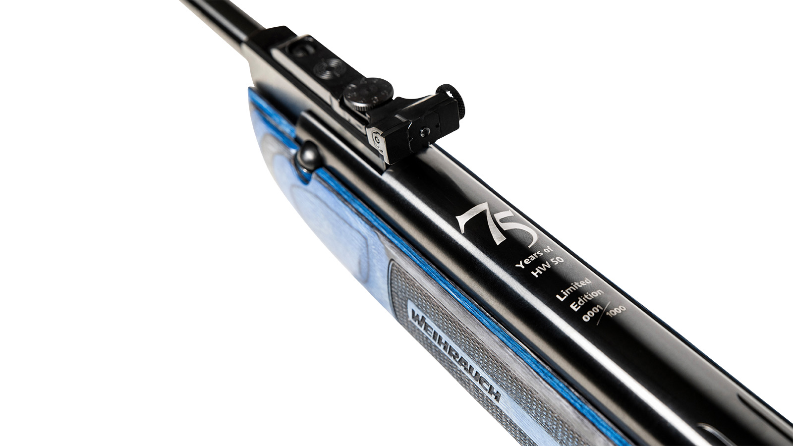 Weihrauchs erstes Luftgewehr, das Modell HW 50 V feiert dieses Jahr seinen 75. Geburtstag. Aus diesem Anlass wurde eine limitierte Sonderserie des HW 50 S über 1.000 Stück aufgelegt. Das Modell kommt mit einem blau-grauen Schichtholzschaft mit spezieller Punzierung und Laserbeschriftung auf den Markt. Die Punzierung am Pistolengriff und das Design des Vorderschaftes sind der Ausführung des ersten Modells nachempfunden. Auf der Unterseite des Pistolengriffs befindet sich zudem eine Lasergravur. Das System ist mit einer offenen Visierung und der Standard-Lauflänge ausgestattet und mit einer limitierten Lasergravur beschriftet.