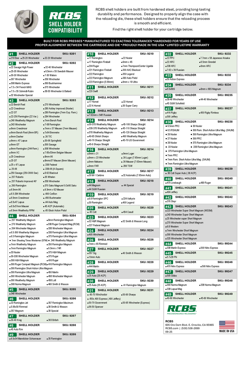 RCBS-Hülsenhalter für Einstationenpressen sind aus gehärtetem Stahl gefertigt und bieten dadurch hohe Langlebigkeit und Leistung. Sie sind so konstruiert, dass sie die Hülse präzise mit der Matrize ausrichten und so einen reibungslosen und effizienten Wiederladevorgang gewährleisten. RCBS-Hülsenhalter sind für Einstationen- und Revolverpressen geeignet. Sie sind auf bestimmte Hülsenböden abgestimmt und erfassen 3,175 mm (0,125 Zoll) des Hülsenbodens für den korrekten SAAMI-Laufabstand. RCBS-Hülsenhalter sind für Einstationen- und Revolverpressen geeignet. RCBS-Hülsenhalter werden mit höchster Präzision gefertigt. RCBS-Hülsenhalter sind gehärtet und somit für jahrelangen Einsatz ausgelegt. RCBS-Hülsenhalter gewährleisten die korrekte Ausrichtung zwischen Patrone und Matrize. Die Hülsenhalter sind 3,175 mm (0,125 Zoll) tief geschnitten, um den korrekten Laufabstand zu gewährleisten. RCBS gewährt eine eingeschränkte lebenslange Garantie. Informationen zur Kompatibilität der Hülsenhalter finden Sie unten.