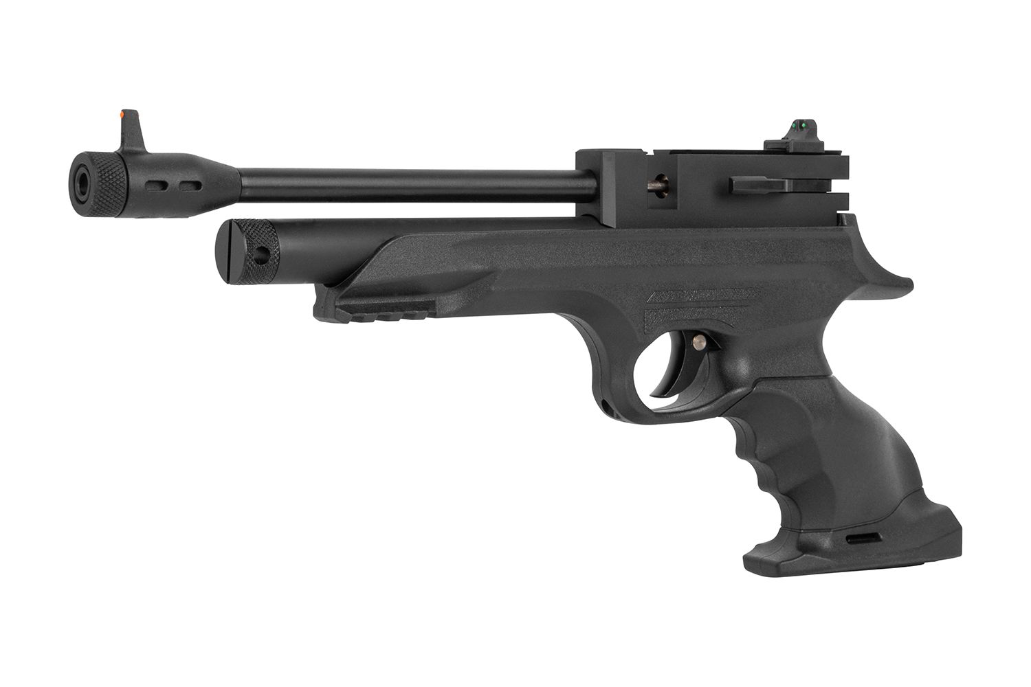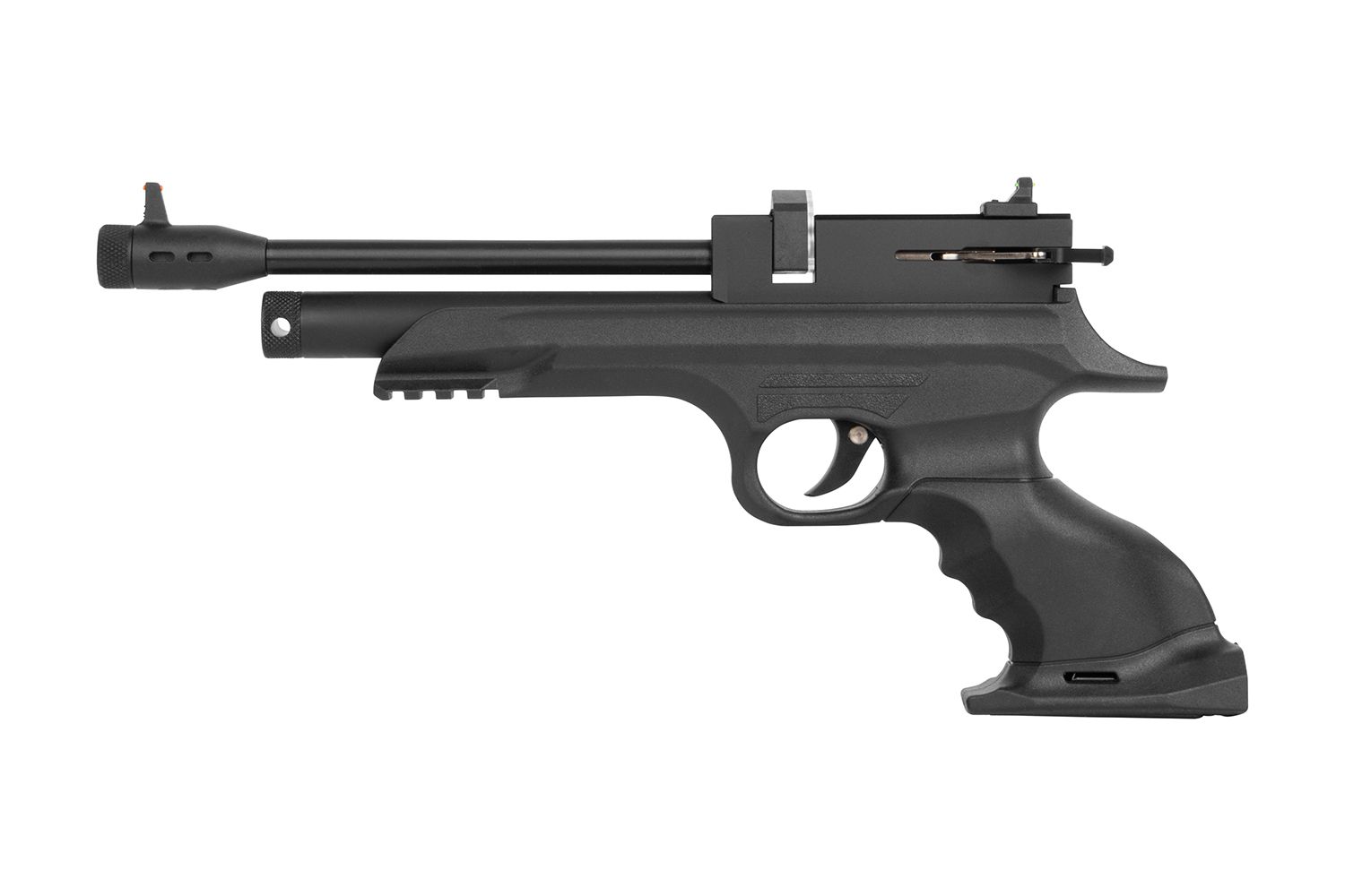 Das seitliche Spannsystem ermöglicht ein komfortables Nachladen. Die Pistole kann wahlweise mit Magazin oder als Einzellader genutzt werden. Eine Fiberoptik-Visierung unterstützt die Zielerfassung, während eine integrierte Schiene die Montage von Zubehör erlaubt.