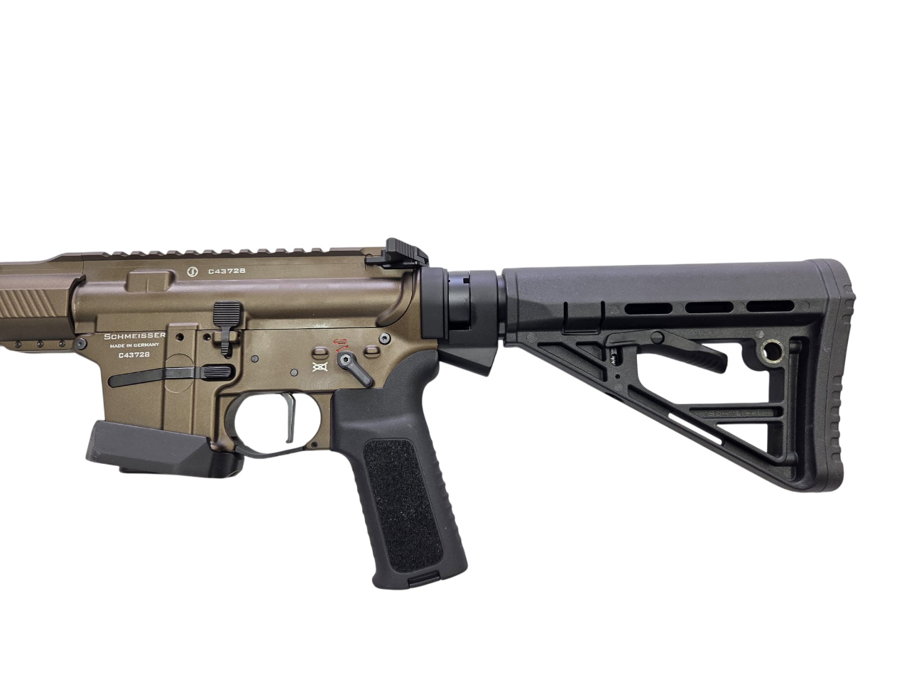 Die neue Schmeisser AR15-9 ist komplett beidseitig bedienbar, des Weiteren wurden die Zuführung sowie der Masseverschluss optimiert. Egal für welche Anforderungen, statisch oder dynamisch, mit der Schmeisser AR15-9 haben Sie das ideale Werkzeug in der Hand. Gewicht: 3640 g Länge: 79,5 cm eingeschoben, 89v5cm ausgezogen Lauf: 14,5“ / 42,5cm, Heavy Barrel brüniert Patronenlager: .223 Rem./ 5.56 NATO" Drall: 1/9 Knopfgezogen Mündungs-feuerdämpfer: NoFlash, Stahl, A2/M4 nach Mil-Spec Gewinde: M14x1 Verschluss: Semi-Auto Verschlussträger, phosphatiert und teilverchromt Oberes Gehäuse: Nach Mil-Spec aus 7075 T6 Aluminium geschmiedet inkl. Picatinny-Profil, harteloxiert Durchladehebel: Beidseitig bedienbar, 6082 T6 Aluminium Handschutz: Freischwingend mit Stahlgewindeeinsätzen (HELICOIL®). 23,2 cm Länge, “Slim-Line” Profil, Picatinny-Schiene oben, dreiseitige M-lokHaltepunkte, harteloxiert Visierung: Verstellbares Flip-Up Kunststoffvisier Korn: Verstellbares Flip-Up Kunststoffvisier Unteres Gehäuse: nach Mil-Spec aus 7075 T6 Aluminium geschmiedet, harteloxiert Schaft: 7 Positionen Hinterschaft Buffer: Standard carbine buffer und Feder Abzug: Druckpunktabzug, Abzugsgewicht 2.400 Gramm (1.500/900 Gramm) Sicherung: Beidseitige Flügelsicherung Griff: Kunststoff Pistolengriff gummiert Magazinkapazität: 10 Schuss Schaftröhre: Solid Tube mit Überwurf, 7075 T6 Aluminium Verschlussfanghebel: Beidseitig bedienbar, Stahl Lieferumfang: 1x Schmeisser AR15-9 S4F 1x Reinigungskordel 1x Schmeisser Waffenkoffer inkl. Zahlenschloss 1x Bedienungsanleitung 1x Reinigungsbürsten ACHTUNG: Zum Kauf dieses Produkts ist die Vorlage der Erwerbsberechtigung erforderlich !!!