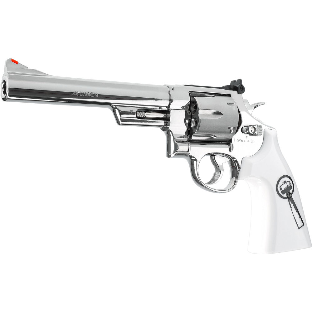 In der Sonderausführung “Trust Me“ glänzt der legendäre Smith & Wesson 629 Revolver mit einer edlen Vernickelung und Griffschalen in Elfenbein-Optik. Geprägt vom actionversprechenden Logo, lässt diese Airgun die Herzen von Serienfans der 80er-Jahre höherschlagen.