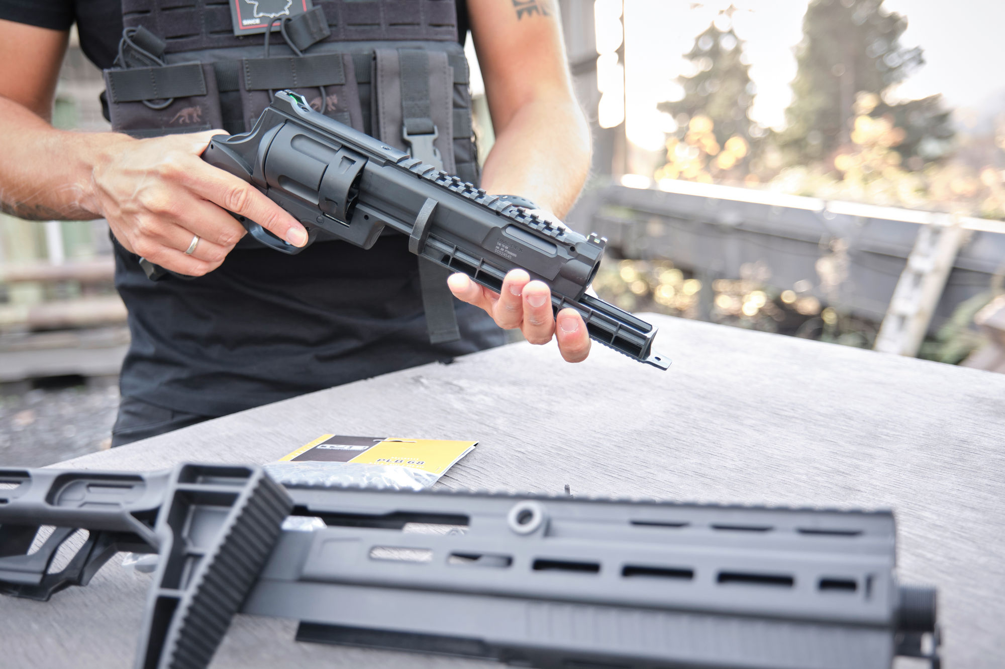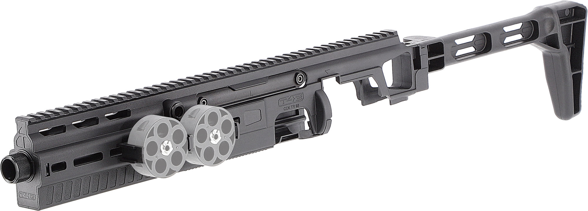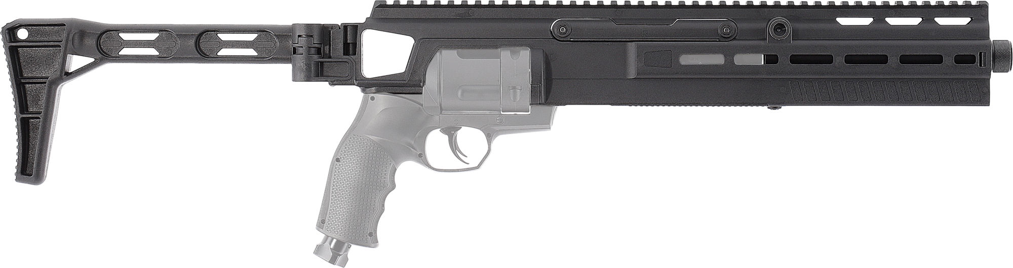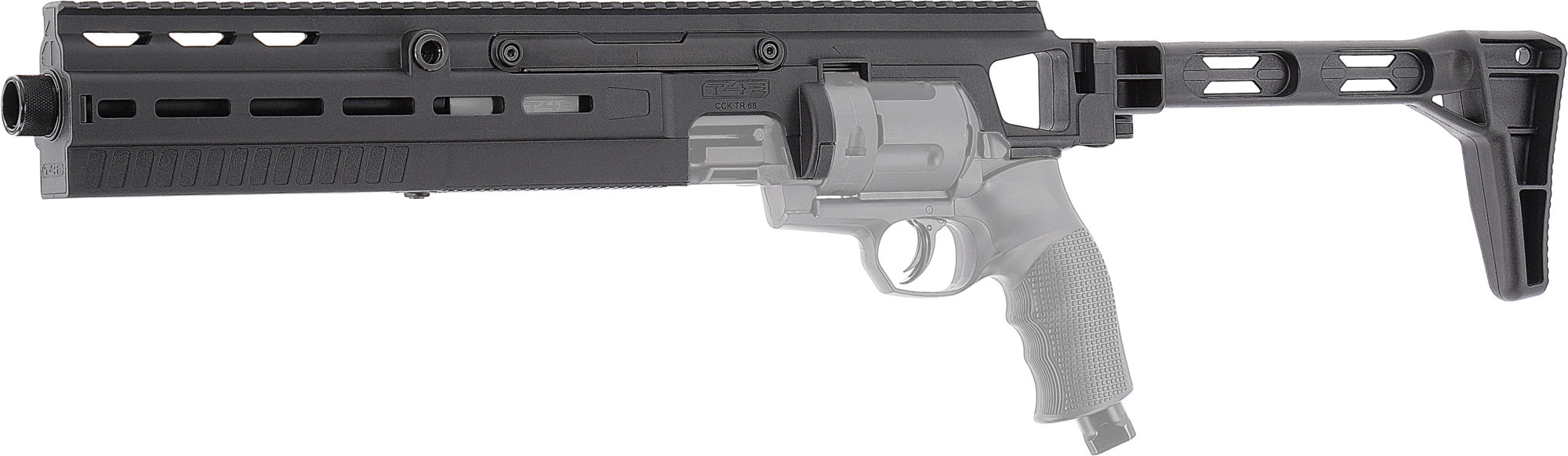 Dieser eindrucksvolle Anschlagschaft steigert die Einsatzmöglichkeiten der T4E TR 68-Modelle, indem er dem eingesetzten Revolver die überlegene Ergonomie und Zubehör-Kompatibilität kompakter Langwaffensysteme verleiht.