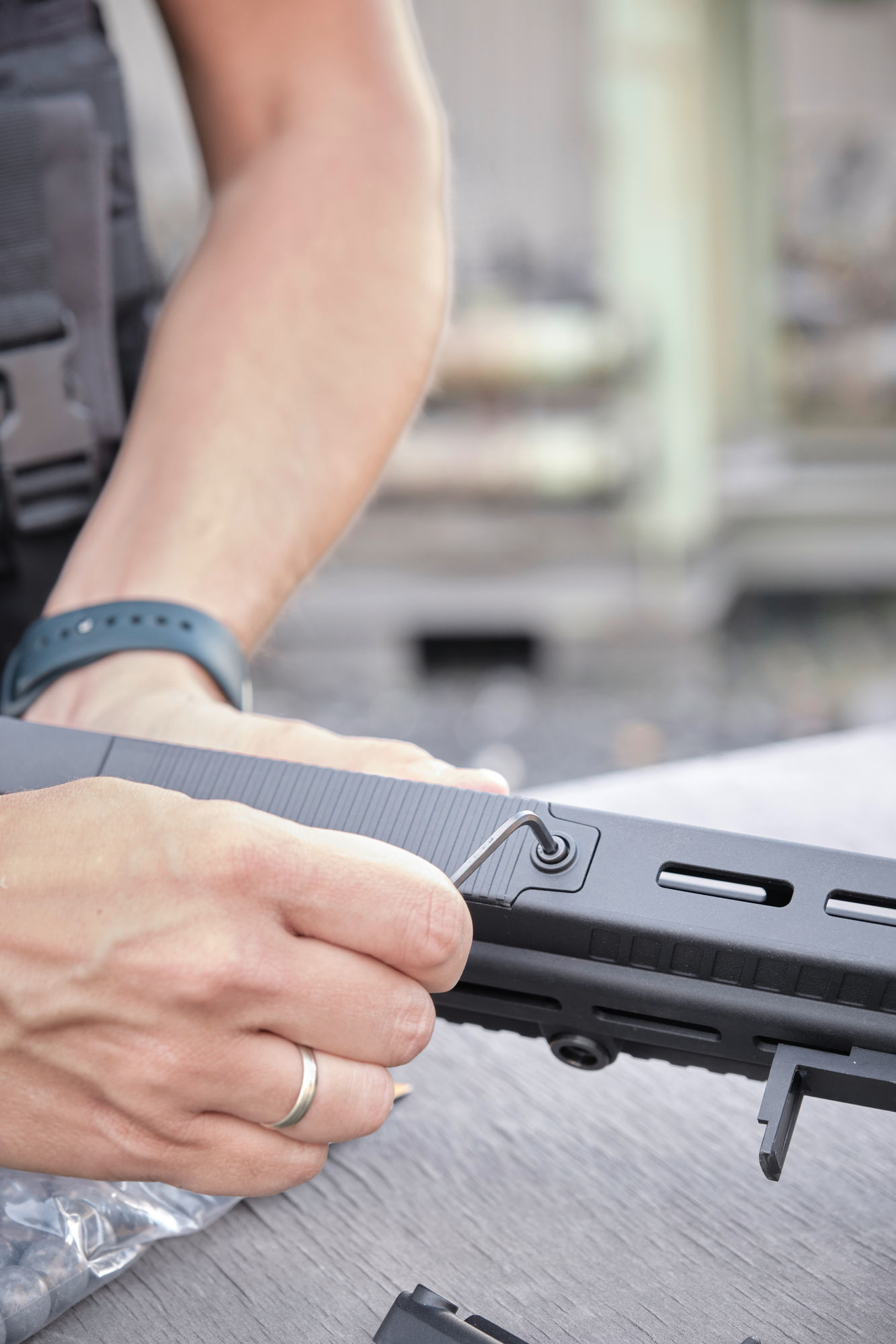 Eine lange Picatinny-Toprail dient zur Aufnahme von Optiken, zusätzliche M-LOK-Slots ergänzen die Kompatibilität mit gängigen Zubehörteilen, wie Zweibeinen, Lasern und Lampen. Insgesamt drei Quick-Detach-Befestigungspunkte (QD) nehmen z. B. Trageriemen auf.