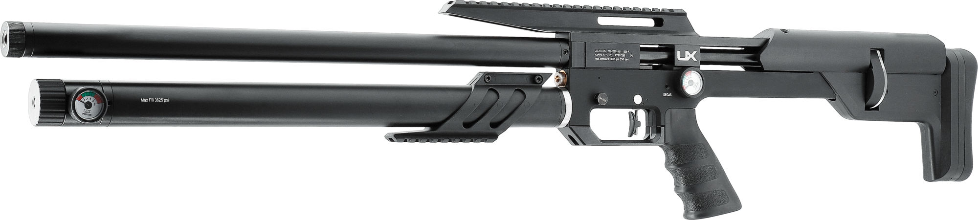 Der integrierte Presslufttank des PCP-Gewehrs verläuft frei unterhalb des Laufs. Er verfügt über ein Manometer und bietet über die Picatinny-Schiene Montagemöglichkeiten für Zubehör. Der maximale Fülldruck liegt bei 3625 psi / 250 bar.