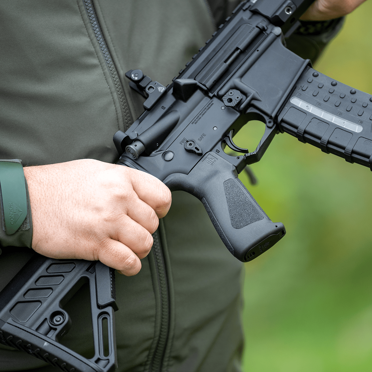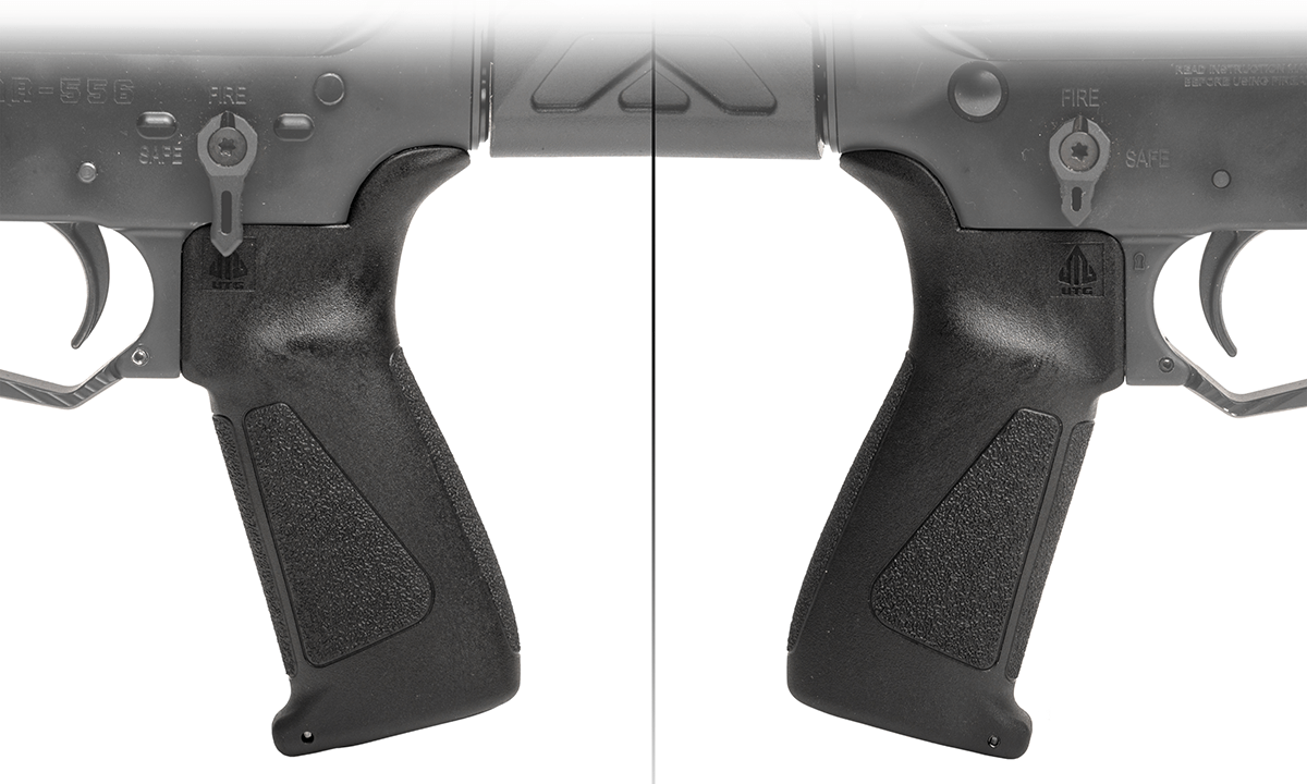 Ergonomischer, geraderer 18°-Griffwinkel, Beavertail-Griffrücken und handfüllende Seitenwölbungen