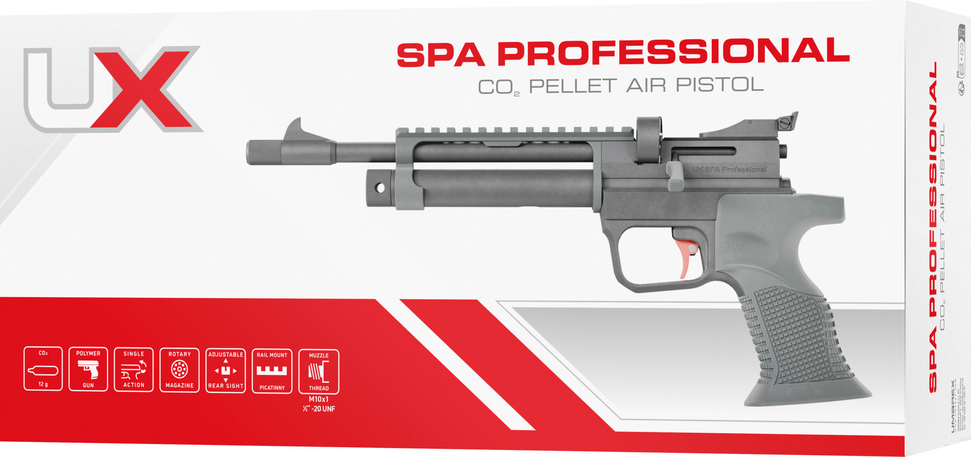 Die sportlich konzipierte CO₂-Pistole UX SPA Professional überzeugt mit ihrem hohen Potential für das anspruchsvolle Freizeitschießen. Der Single-Action Repetierer ist mit einem gezogenen Lauf und einem Trommelmagazin für Diabolos (Kal. 5,5 mm) ausgestattet, und der ergonomische Formgriff eignet sich gleichermaßen für Links- wie Rechtshänder. Der trocken stehende Sportabzug ist mit einem Metallzüngel ausgestattet. Eine Mikrometervisierung mit hinterschnittenem Scheibenkorn ist perfekt für alle Traditionalisten, und die Option, auch Optiken mit 11mm- oder Picatinny-Basis zu montieren, erweitert das Einsatzspektrum im Hinblick auf eine Rotpunktmontage. Wer lärmempfindliche Nachbarn hat, wird das Mündungsgewinde (M10x1) zu schätzen wissen, das sich per beiliegendem Adapter (1/2“-20 UNF) zur Montage eines Schalldämpfers nutzen lässt. Eine Einzelschuss-Lademulde ist ebenfalls im Lieferumfang enthalten.