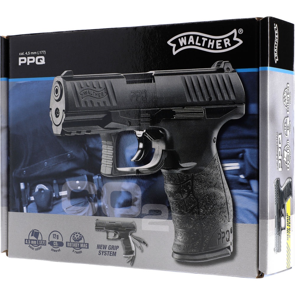 Der originalgetreue Nachbau als CO₂-Pistole basiert technisch auf dem seit Jahrzehnten bewährten Trommelmagazin-System, das in vielen weltweit beliebten Umarex CO₂-Waffen erfolgreich verwendet wird. Eine einstellbare Kimme sowie eine unter der Mündung angebrachte Picatinny-Schiene bieten dem Schützen zahlreiche Möglichkeiten, die Walther PPQ seinen Bedürfnissen anzupassen.