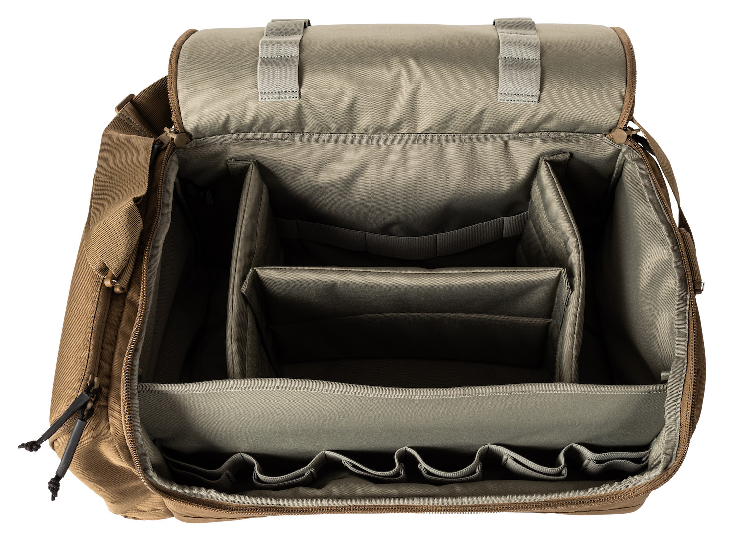 Der Range Ready Trainer Bag bietet Platz für alles, was Du für einen Tag auf dem Schießstand brauchst. Die Tasche ist vollständig gepolstert und hat eine Polyethylen-Platte im Boden um Deine Ausrüstung zu schützen. Mit herausnehmbaren Trennwänden kannst Du die Tasche individuell anpassen. Ein Innenfach für schnellen Zugriff mit elastischen Schlaufen für Magazine und Zubehör sowie elastische Schlaufen unter dem Deckel bieten viel Platz, egal wohin Du gehst - und das nur im Hauptfach. Drei Seitenfächer und MOLLE-Schlaufen lassen Dich noch mehr mitnehmen.