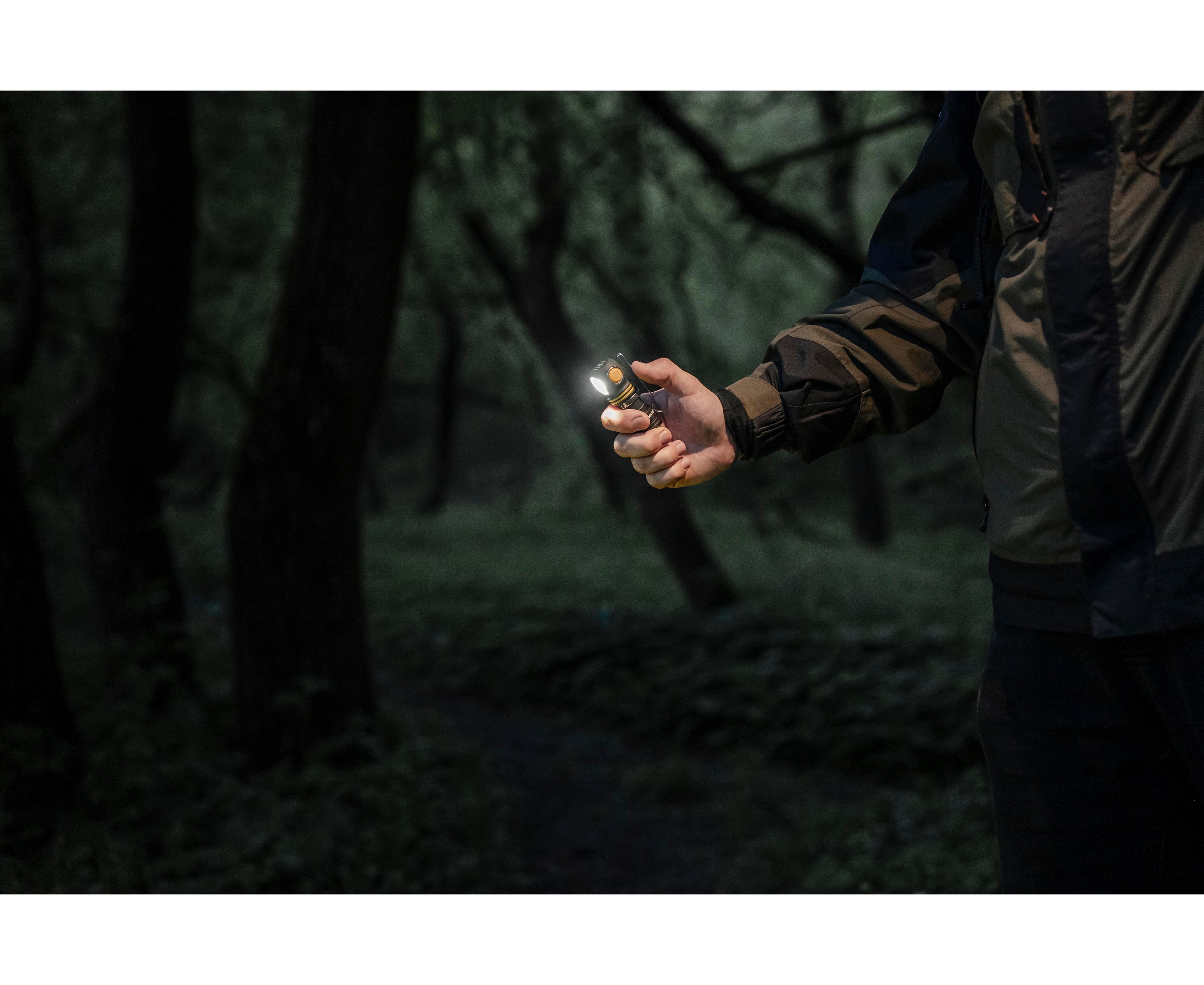 Die Taschenlampe kann zusammen mit der Stirnhalterung verwendet, mit dem Clip an der Kleidung befestigt oder dank des eingebauten Magneten an Metallflächen angebracht werden. Eine spezielle Öffnung im hinteren Deckel ermöglicht es außerdem, die Elf C1 am Schlüsselbund zu tragen. Das Modell ist auch mit optionalem Zubehör kompatibel: der AHM-Serie von Helmhalterungen für industrielle Arbeiten und das Bergsteigen.