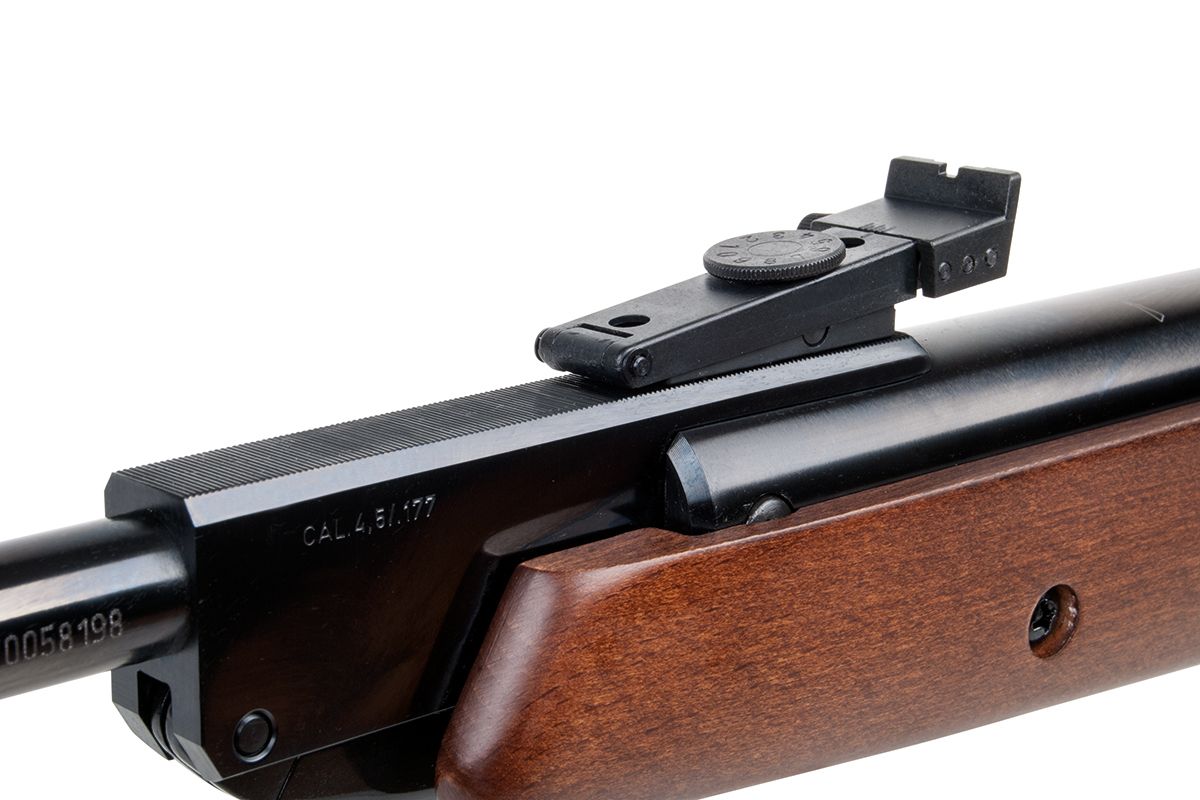 Bewährtes Sport- und Trainingsluftgewehr für Hobby und Freizeit in handlicher und solider Konzeption – mit starker Kolbenfeder und vorzüglicher Schussleistung für die ganze Familie. Automatische Sicherung, Tunnelkornfuß mit auswechselbaren Kornblättern und dem fein einstellbaren Matchabzug „Rekord“, höhen- und seitenverstellbares Mikrometervisier mit vier verschiedenen Kimmenausschnitten. Buchenschaft mit langem, führigem Vorderschaft und beidseitiger Backe, Punzierung am Pistolengriff und Vorderschaft, für Rechts- und Linkshänder, Gummischaftkappe. Lauf: 395 mm System: Kipplauf mit Kugelverschluss Visier: verstellbares Mikrometervisier, Tunnelkornfuß mit auswechselbaren Kornblättern Ausführung: schwarz brüniert Abzug: Matchabzug Rekord Gesamtlänge: 1.030 mm Gewicht: 3,1 kg Energie: max. 7,5 Joule Kal. 4,5 mm