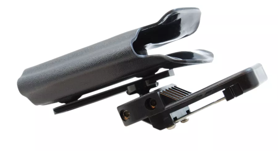 Die neue Schiene ist nun parallel zum Schlitten der Waffe am Holsterkörper angebracht, was den nutzbaren Verstellbereich im Kugelgelenk erhöht und es Ihnen ermöglicht, die Waffe viel näher am Körper zu bringen als mit dem vorherigen Schienendesign.