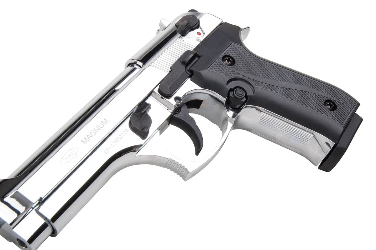 Die Ekol Firat Magnum P92 ist eine Nachbildung der Beretta 92 im Kaliber 9 mm P.A.K. Die halbautomatische Schreckschusspistole verfügt über einen Double-Action-Abzug, einen Metallschlitten, ein Griffstück aus leichtem Polymer und eine Picatinny-Schiene. Die Lieferung erfolgt inkl. Koffer, Zusatzlauf für Pyrotechnik und Reinigungsbürste. Der Erwerb und Besitz aller von GSG angebotenen Gas- und Signalwaffen und der dazugehörigen Munition ist erlaubnisfrei ab 18 Jahren. Zum Führen einer Gas- und Signalwaffe bedarf es einer behördlichen Erlaubnis (kleiner Waffenschein).EKOL Firat P92 Magnum 9mm P.A.K: Die vielseitige Schreckschusswaffe im Beretta-Design Modernes Design mit hoher Funktionalität Leichter Polymerrahmen, robuster Metallschlitten Ergonomischer Griff mit rutschfesten Kunststoffgriffschalen Skelettierter Hammer Zweireihiges Magazin mit 17 + 1 Schuss Single-/Double-Action-Abzug Manuelle Sicherung beidseitig bedienbar 22mm Schiene unter dem Lauf Laufmündung mit Gewinde Inkl. Koffer & Zusatzlauf Kaliber: 9 mm P.A.K. System: Gas Signal Magazinkapazität: 17 Schuss Abzug: Double Action / Single Action (DA/SA) Abzug einstellbar: Nein Lauf: Stahl Laufgewinde: M10x1,5 Visierung: Starre Visierung Optic Ready: Nein Griffstück: Polymer Verschluss: Metall Montageschiene: 22mm Picatinny Farbe: Schwarz Gewicht: 870 g Gesamtlänge: 215 mm Die Pistole wird in einem Koffer inkl. Abschussbecher, Reinigungsbürste und einer Bedienungsanleitung ausgeliefert.