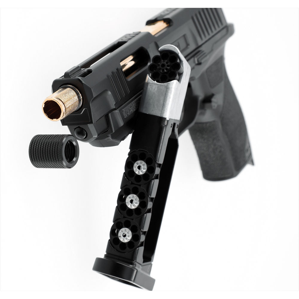 Eine wirklich einzigartige CO₂-Pistole, die auffällt. Das liegt zum einen an den Sichtfenstern im schweren Verschluss. Durch diese kann man den messingfarbigen Lauf sehen, der im übrigen ein Laufgewinde für einen Schalldämpfer besitzt. Völlig neuartig ist jedoch das herausnehmbare Magazin, das sowohl die CO₂-Kapsel trägt wie auch als Halter für die drei beiliegenden Ersatz-Laderinge dient. Sowohl Diabolos wie auch BBs lassen sich verschießen, sogar gemischt. Durch den Metallschlitten wird fast ein Kilo Gewicht erreicht.