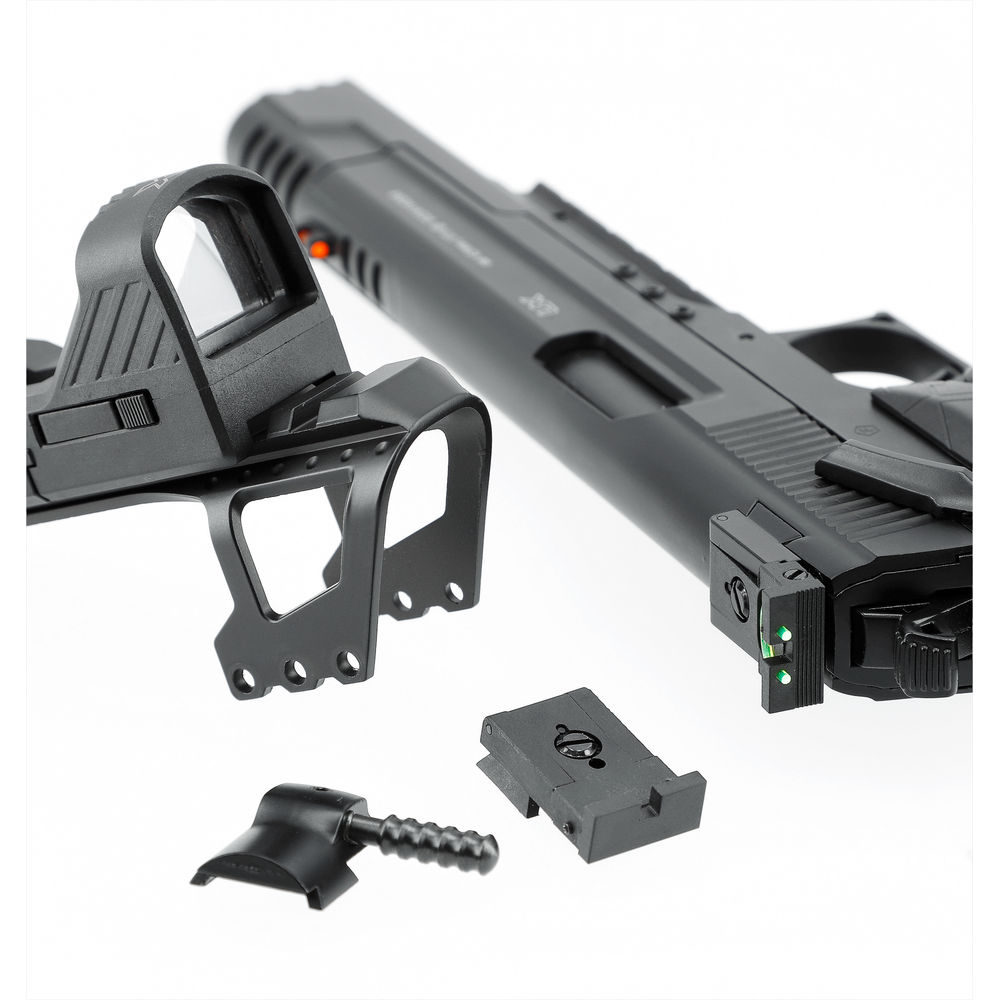 Mitgeliefert wird das Umarex GDS Point Sight, eine zusätzliche Montageschiene mit Picatinny-Profil sowie ein Slide Racker. Dieses nützliche Utensil wird anstelle des Visiers eingesetzt und erleichtert bei montiertem Point Sight das Durchladen der Waffe.