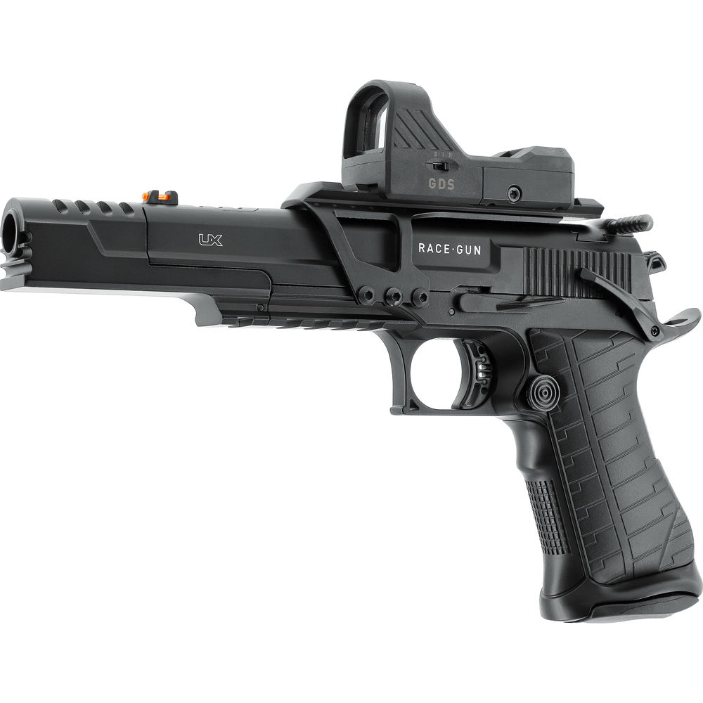 Das Modell Racegun verfügt über solche Features wie zum Beispiel Kompensator, verlängerte Bedienelemente und Jet Funnel. Der Blowback-Effekt und die Ganzmetall-Bauweise dieser Waffe vermitteln einen realistischen Gesamteindruck. Ein interessantes Ausstattungsmerkmal ist die austauschbare, einstellbare Visierung. Der Schütze hat hier die Möglichkeit, zwischen Fibervisier und Standardvisier zu wählen.