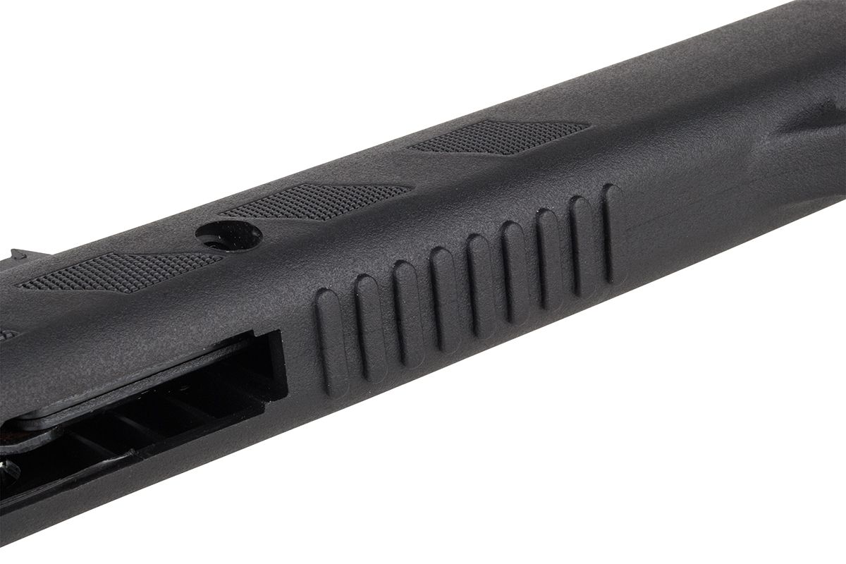 Das GSG SR1000S ist ein klassisches Knicklauf-Gewehr, ideal für Einsteiger. Das recht hohe Gewicht vermittelt trotz des Kunststoffschaftes ein hochwertiges Empfinden. Das Modell verfügt über eine manuelle Sicherung, eine einstellbare hintere Visierung, einen integrierten Silencer, Fischhautmuster am Griffstück, eine gefräste 11 mm-Prismenschiene und eine gummierte Schaftkappe. Das Modell ist für Rechts- und Linkshänder geeignet. Robuster Kunststoffschaft Einstellbarer Abzug Einstellbare hintere Visierung Integrierter Silencer Gefräste 11mm Prismenschiene Gummierte Schaftkappe Kaliber: 4,5 mm (.177) System: Federdruck | Knicklauf Munitionstyp: Pellets Lauf: gezogener Lauf Magazinkapazität: 1 Schuss Abzug: Einstellbar Farbe: Schwarz Gewicht: 3.660 g Gesamtlänge: 1.220 mm Energie: max. 170 m/s