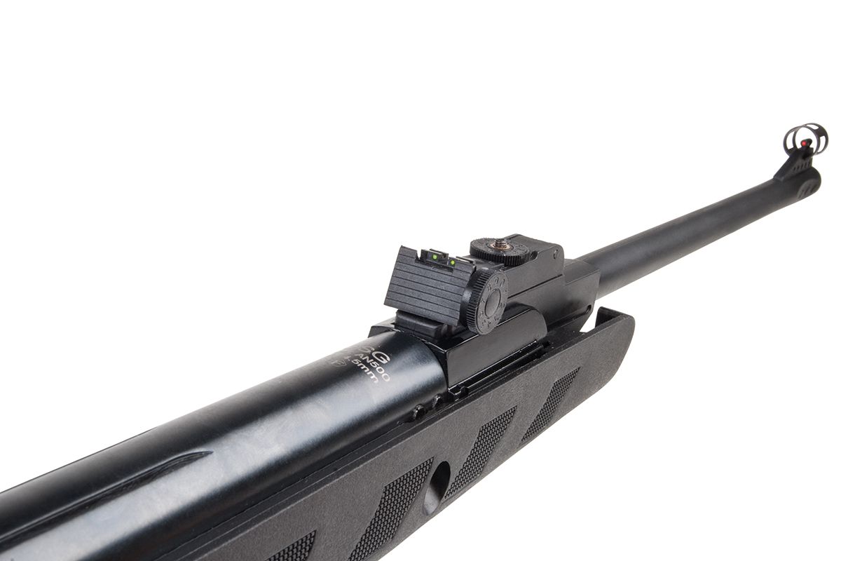 Das GSG AN500 ist ein klassisches Knicklauf-Gewehr, ideal für Einsteiger. Das geringe Gewicht macht es auch attraktiv für weibliche Hobbyschützen. Das Leuchtpunktvisier ermöglicht zudem ein präzises Schießen auch bei widrigen Witterungsverhältnissen. Das Modell verfügt über einen offenen Korntunnel, eine einstellbare Mikrometer-Visierung, eine ventilierte Schaftkappe und eine gefräste 11mm Prismenschiene.