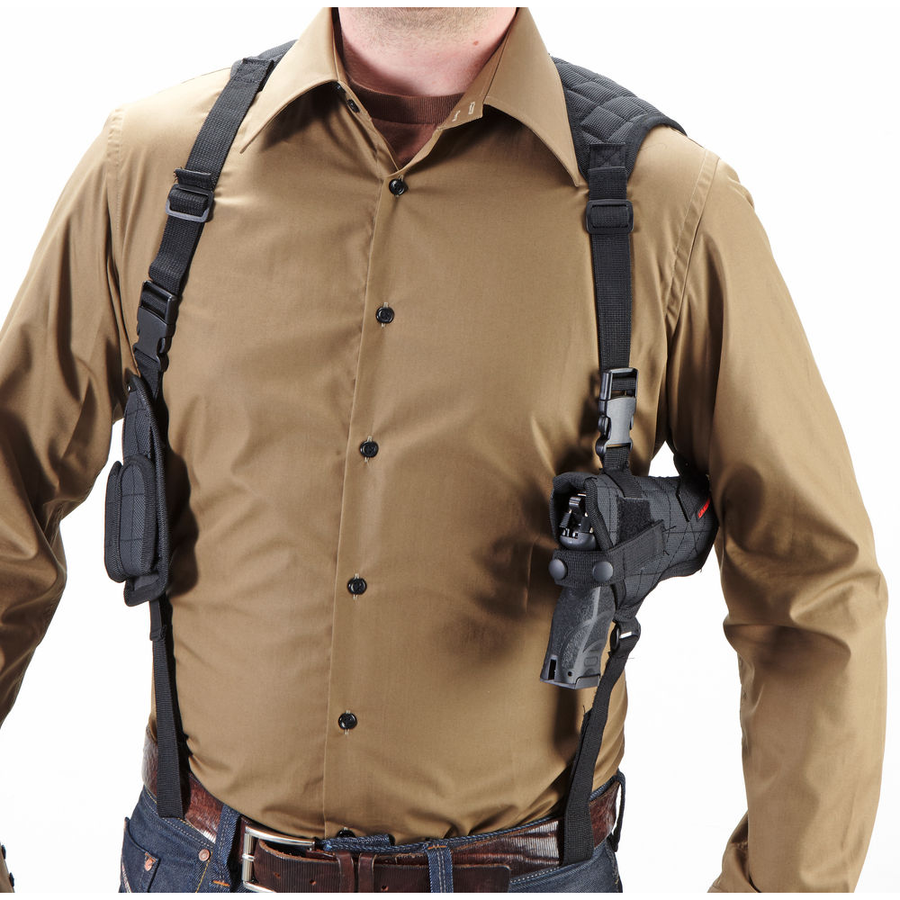 UTG Law Enforcement horizontales Luxus-Schulterholster Beschreibung: Universell einsetzbar für die meisten gängigen Pistolen und Revolver Hohe Qualität und durchdachte Funktionalität und Ausstattung Für Rechts und Links Händer gepolsterte Schultergurte, weiches Futter im Hoster zum Schutz ihrer Waffe, 2 Magazintaschen individuell einstellbar durch Klettbänder Produktspezifikation: Gewicht: 340g Material: Polyester Farbe: Black / Woodland Schusswaffenmodell: Die meisten Kompakt- bis großen Pistolen Lauflänge: 15,24cm Hand: Links / rechts umkehrbar
