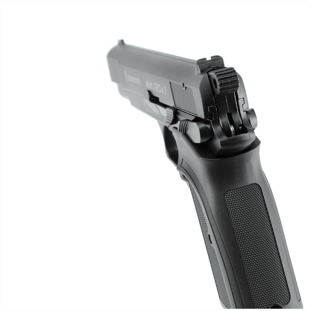 Eine legendäre Konstruktion des genialen John Moses Browning, der seiner Zeit stets einen Schritt voraus war. Schon mit dem Vorgängermodell bewies Browning seine Innovationskraft. Bis heute vertrauen Militärs und Spezialeinheiten auf der ganzen Welt dieser robusten und wegweisenden Konstruktion. Wie es sich für eine legendäre Browning gehört, ist die GPDA 9 natürlich aufwändig ausgestattet: Wir haben sie mit einem Spannabzug optimiert und ihr neben dem funktionierenden Schlittenfanghebel noch einen beidseitig bedienbaren Entspannhebel spendiert. Browning GPDA 9 - Die Gas-Signal-Waffe für Profis im starken Kaliber 9 mm P.A.K., hier schwarz, mit Kunststoffgriffschalen.