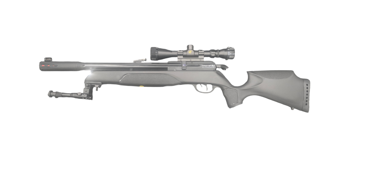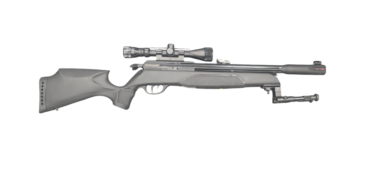 Entwickelt und gefertigt in Spanien, steht das Arrow für ansprechendes Design zu einem unschlagbaren Preis-Leistungs-Verhältnis. Der glasfaserverstärkte Kunststoffschaft liegt gut in der Hand und die Bedienung des Geradezugrepetierers ist sowohl für Rechts- als auch Linkshänder ohne Probleme möglich. Den Spannhebel leicht nach unten drücken, zu sich ziehen und nach vorne schieben. Die umfangreichen Ausstattungsmerkmale des Arrows, wie Fusion Schalldämpfer oder CAT-Abzug, lassen keine Wünsche offen. Mit der offenen Visierung kann problemlos auch ohne Zielfernrohr geschossen werden und der maximale Fülldruck der Kartusche von 232 Bar lässt das Befüllen der Kartusche mit einer Handpumpe zu. Antrieb: PCP Energie: Maximal 7,5 Joule Gewicht: 2300 g Gesamtlänge: 100 cm Mehrschüssig: 10 Schuss Abzug: CAT Schalldämpfer: Fusion Zielfernrohr: Nein Visierung: Truglo – Kimme verstellbar Schiene: 11 mm – aufgesetzt Schaftkappe: ventiliert Schaft: Polymer