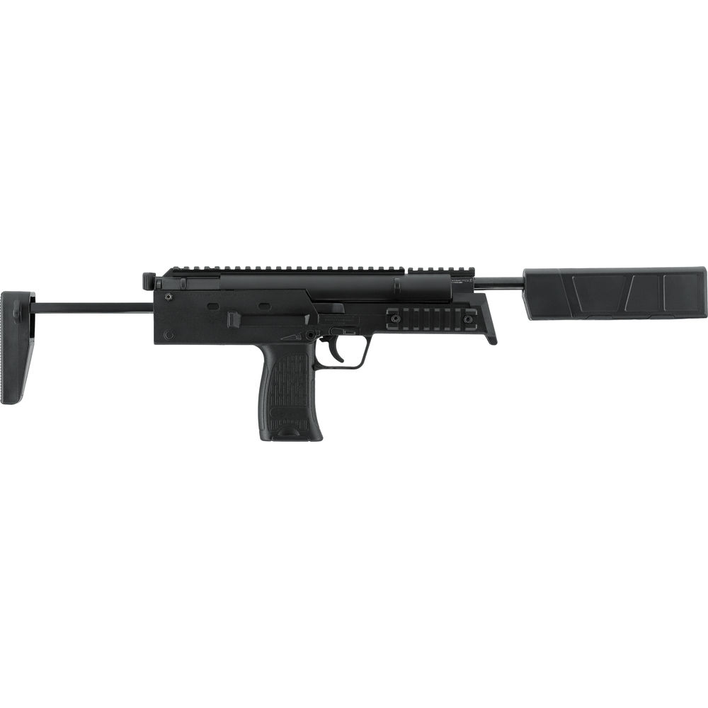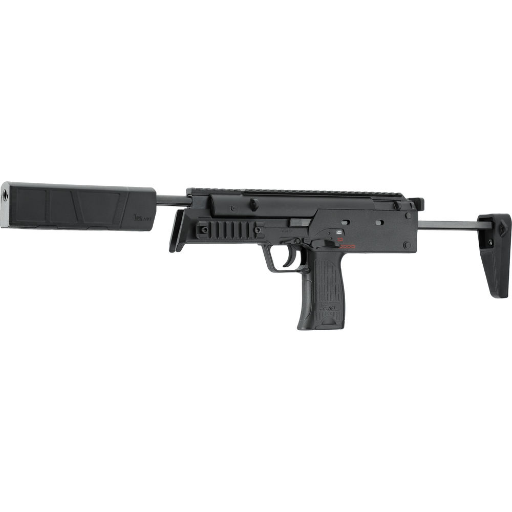 Auf den ersten Blick vermutet niemand eine klassische Knicklauf-Druckluftwaffe hinter diesem Design, obwohl es auch in diesem Bereich mächtig punktet. Ähnlich wie ihr Original siedelt sich diese Airgun zwischen den Gewehren und Pistolen an. Der Vorderschaft und der ausziehbare Schaft garantieren ein sicheres Handling und eine deutlich gesteigerte Präzision gegenüber einer herkömmlichen Pistole, während sie deren leichte und kompakte Bauform behält. Die Schalldämpfer-Attrappe erleichtert das Spannen der kraftvollen Feder, die der MP7 eine Energie bis 7,5 Joule verleiht. Stilecht bietet die MP7 über Picatinny-Schienen zahllose Montagemöglichkeiten für Optiken und weiteres Zubehör.
