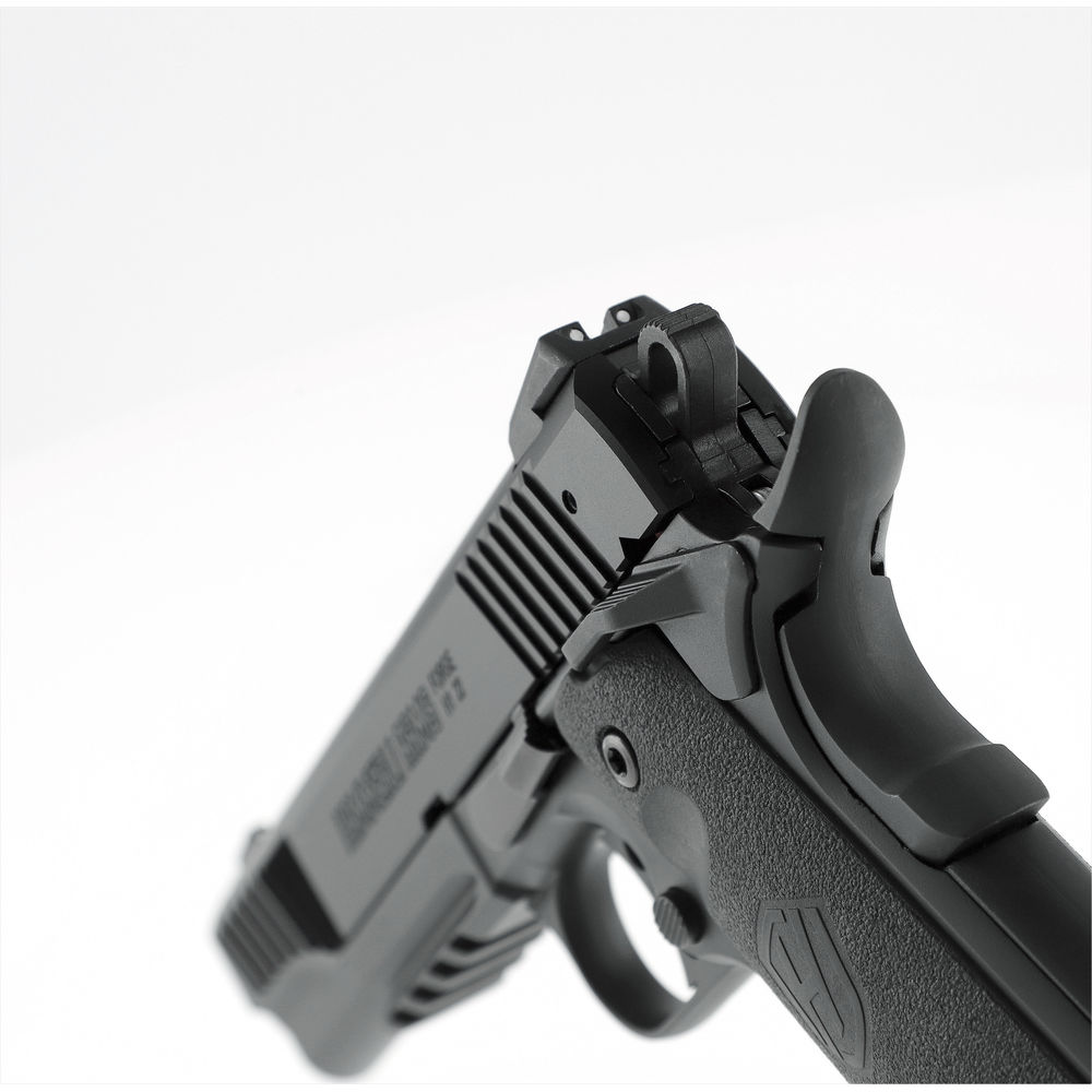 In der Zielaufnahme profitieren Schützen von einer übersichtlichen Dreipunktvisierung mit Kontrastpunkten und einer driftbaren Kimme, die durch ihre flache Bauweise ohne senkrecht herausragendes Kimmenblatt das sichere Ziehen der Forge unterstützt. Die aufgeschraubten Santoprene-Griffschalen sind rutschfest und entsprechen dem 1911-Standard. Zur Personalisierung des Schießerlebnisses können sie mit den unzähligen Optionen der 1911-Griffschalen vom Zubehörmarkt ersetzt werden. Ebenso erlaubt die Picatinny-Schiene die Aufnahme verschiedenen Zubehörs zur weiteren Anpassung an die individuellen persönlichen Bedürfnisse.