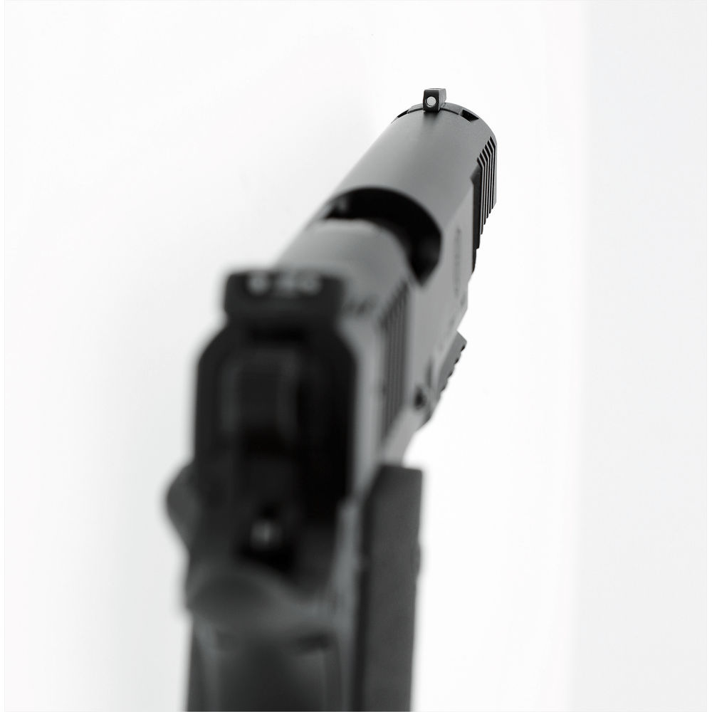 In der Zielaufnahme profitieren Schützen von einer übersichtlichen Dreipunktvisierung mit Kontrastpunkten und einer driftbaren Kimme, die durch ihre flache Bauweise ohne senkrecht herausragendes Kimmenblatt das sichere Ziehen der Forge unterstützt. Die aufgeschraubten Santoprene-Griffschalen sind rutschfest und entsprechen dem 1911-Standard. Zur Personalisierung des Schießerlebnisses können sie mit den unzähligen Optionen der 1911-Griffschalen vom Zubehörmarkt ersetzt werden. Ebenso erlaubt die Picatinny-Schiene die Aufnahme verschiedenen Zubehörs zur weiteren Anpassung an die individuellen persönlichen Bedürfnisse.